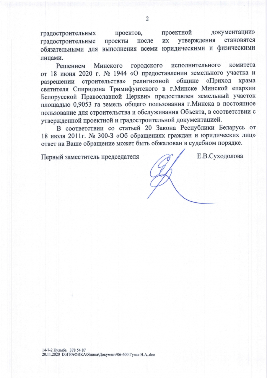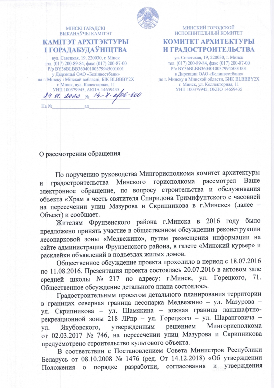 Как следует из ответа администрации Фрунзенского района г.Минска от 22.10.2020, полученного нами, в июне этого года горисполком предоставил одной из общин Минской епархии БПЦ «земельный участок площадью 0,9053 га земель общего пользования г.Минска в постоянное пользование для строительства и обслуживания объекта “Храм в честь святителя Спиридона Тримифунтского с часовней на пересечении улиц Мазурова и Скрипникова в г. Минске”».