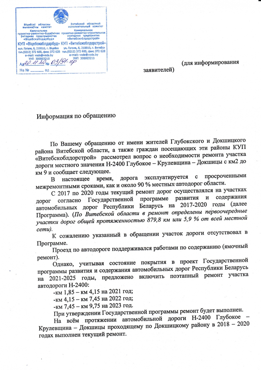В связи с вышеописанной ситуацией, руководствуясь ст.41 Закона "О местном управлении и самоуправлении в Республике Беларусь", устанавливающей, что исполкомы в пределах своей компетенции в порядке, установленном законодательством, организуют строительство, реконструкцию, ремонт и содержание местных автомобильных дорог, управляют дорожной деятельностью, устанавливающей, что мы просим провести в 2021 году ремонтные работы на участке дороги Н-2400 Глубокое — Крулевщина — Докшицы с 2 по 9 километр. В случае невозможности проведения ремонтных работ на всём участке просим обновить дорожное покрытие на тех отрезках, где покрытие наиболее изношено.