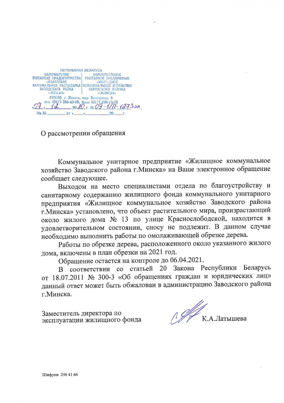 В отношении растительного объекта, указанного в обращении, необходимо только выполнить работы по омолаживающей обрезке. Работы по обрезке дерева включены в план обрезки на 2021 г.