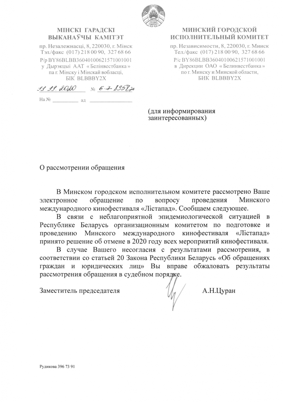 Как люди, увлечённые кино, мы хотим увидеть фильмы, которые могут попасть на наши экраны только в рамках «Лiстапада». Но вместе с тем понимаем, что никакое кино не стоит жизни зрителей или их близких. Поэтому просим обратить внимание на пандемию коронавируса, не перекладывать ответственность на зрителей и принять адекватные меры.