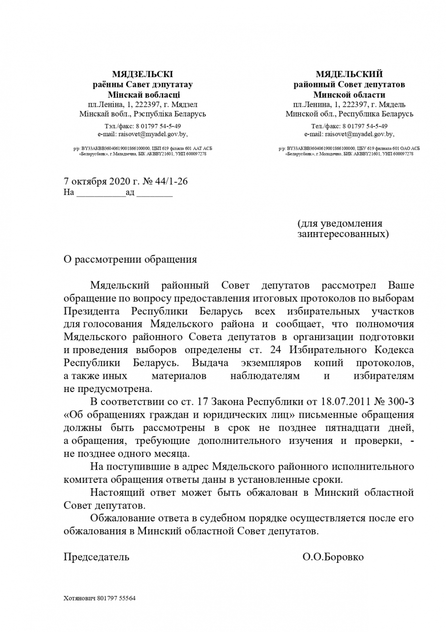 07 октября 2020г. был получен ответ на электронное обращение (копия прилагается). Указанный ответ считаем не соответствующим требованиям законодательства в части полного, всестороннего и объективного рассмотрения обращений и направления мотивированных и обоснованных ответов гражданам, т.к. в запросе было требование итогов Выборов 2020г. по Мядельскому району, а не предоставление копий протоколов.