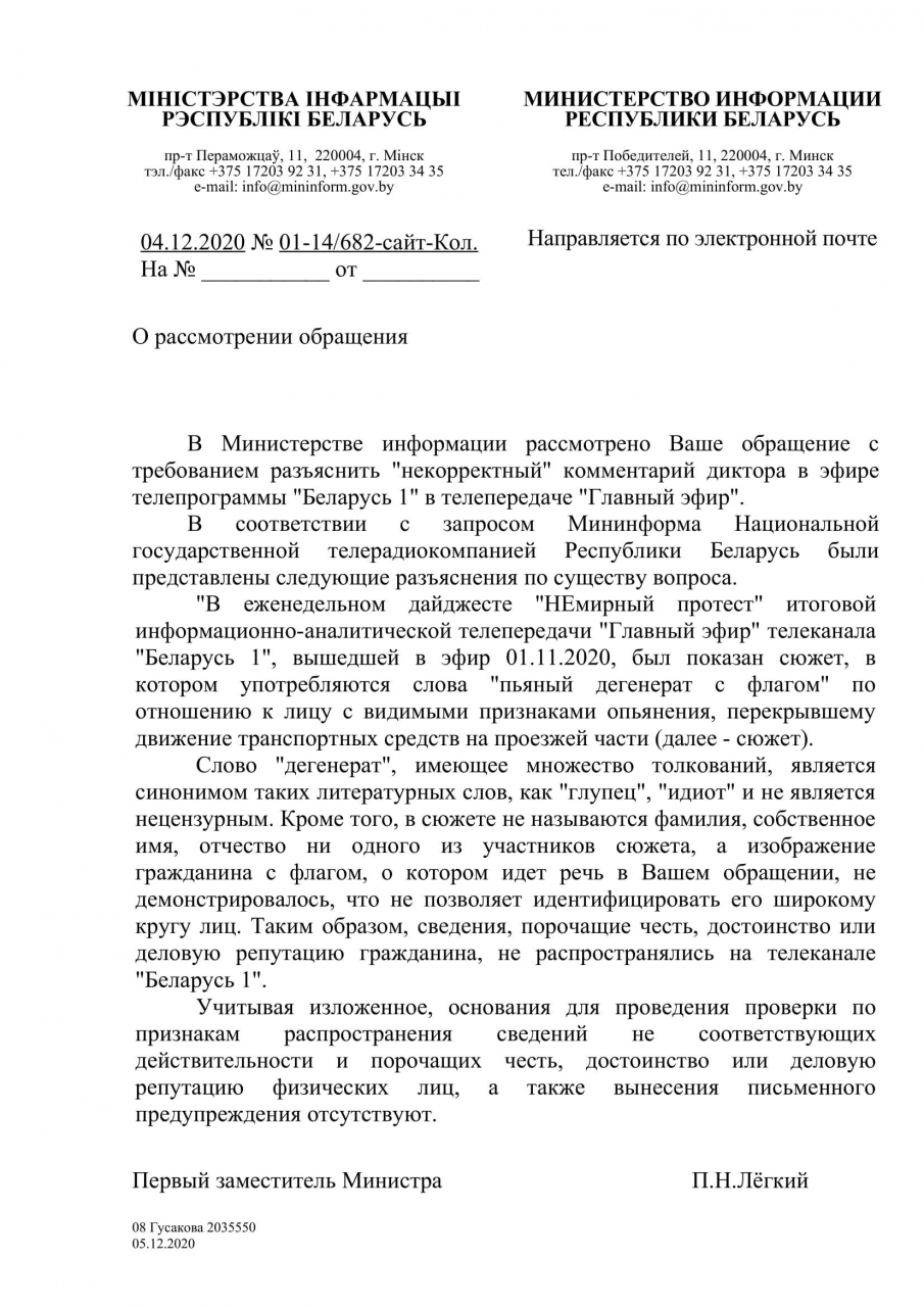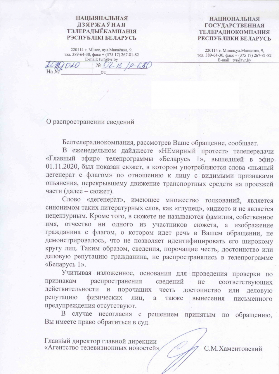 В эфире телеканала «Беларусь 1» в передаче «Главный эфир» (выпуск от 1 ноября 2020 г.) в дайджесте «НЕмирный протест» диктор, комментируя видео, на котором мужчина жестоко избивает парня с БЧБ-флагом, позволяет себе назвать избиваемого «пьяным дегенератом». Ссылка на указанный выпуск прилагается.