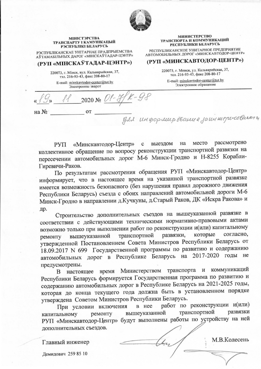 Просим внести в программу работ на 2021 год проектирование и реконструкцию развязки трассы М6 (Минск-Гродно) и H8255 для обеспечения безопасного съезда на дорогу Н8255 в сторону д. Кучкуны и безопасного заезда с дороги Н8255 со стороны д.Кучкуны на трассу М6 в сторону г.Гродно.