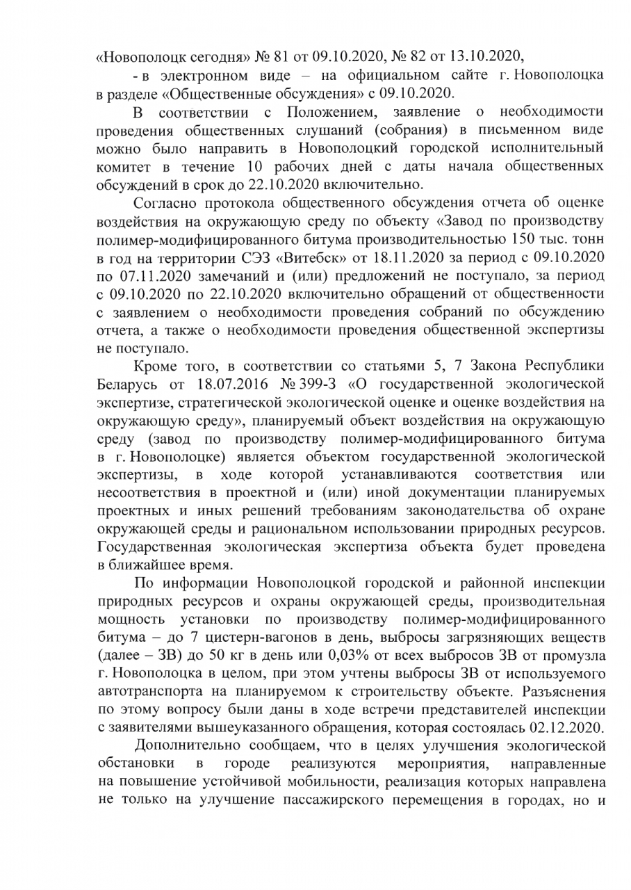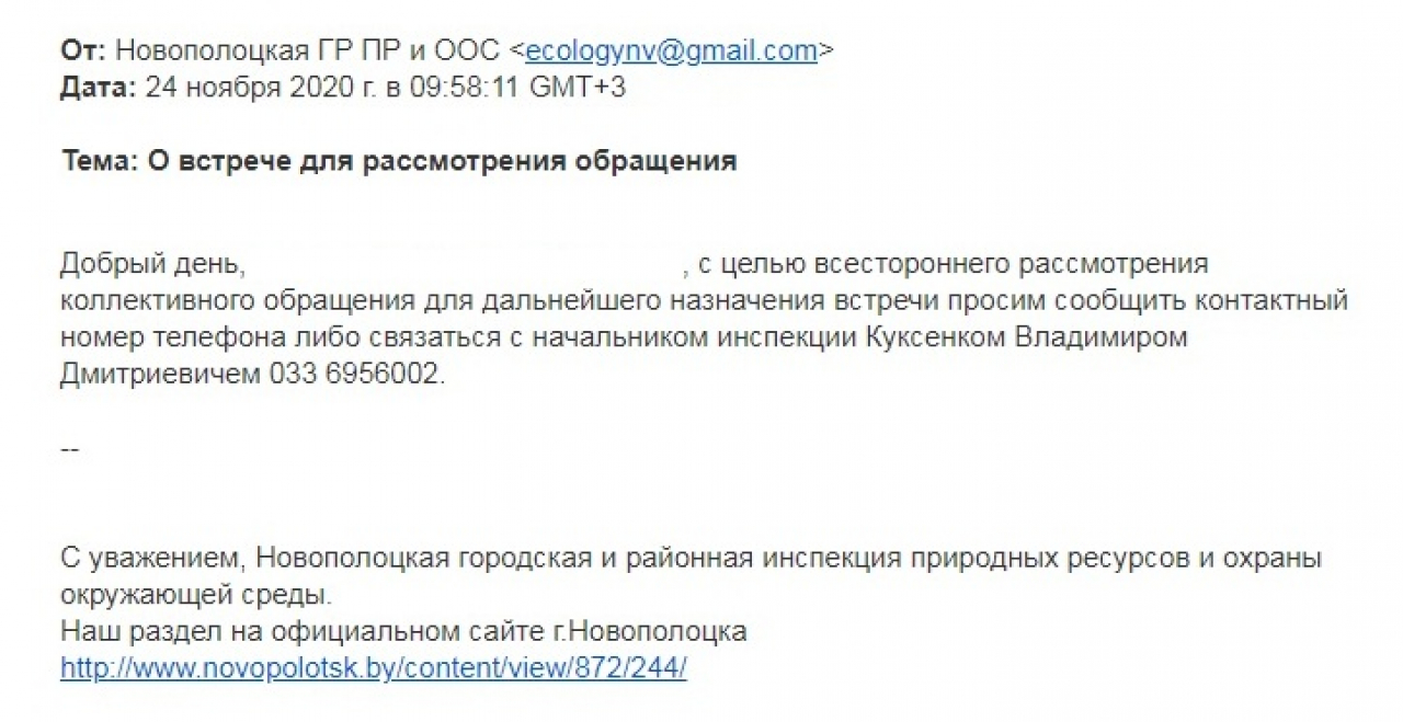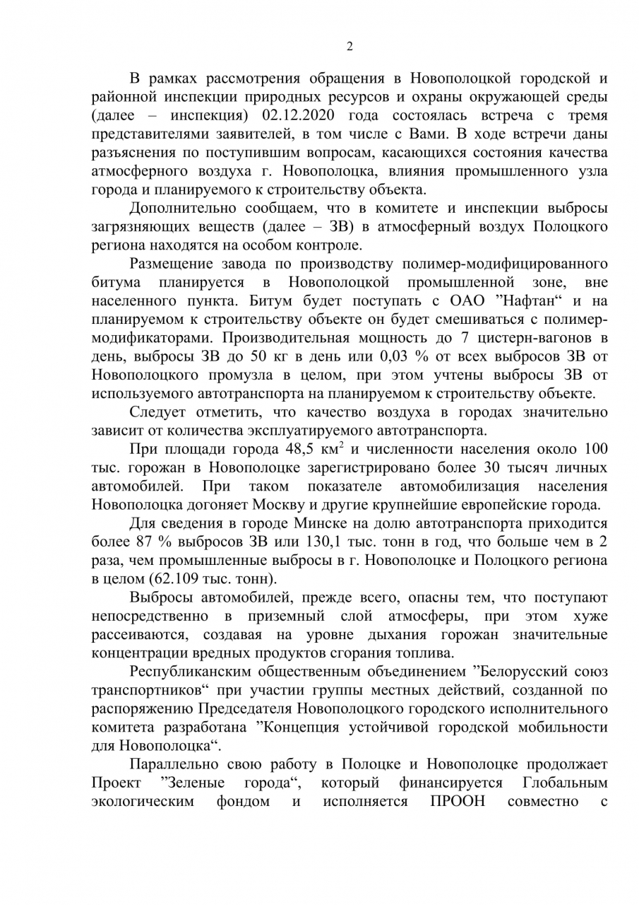 В рамках рассмотрения обращения в Новополоцкой городской и районной инспекции природных ресурсов и охраны окружающей среды 02.12.2020 состоялась встреча с тремя представителями заявителей, в том числе с автором петиции. В ходе встречи даны разъяснения по поступившим вопросам, касающихся состояния качества атмосферного воздуха г.Новополоцка, влияния промышленного узла города и планируемого к строительству объекта.