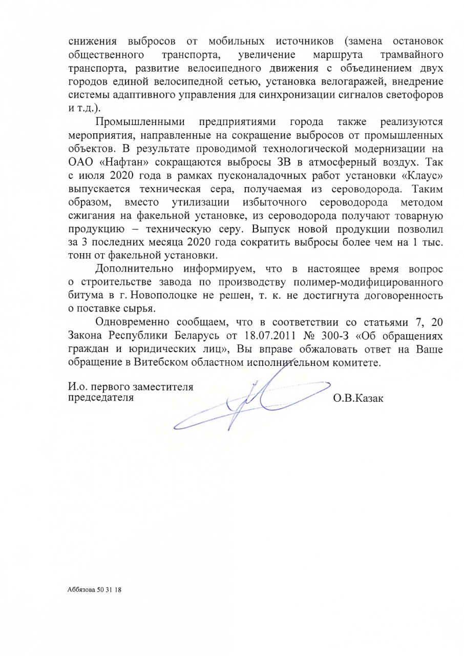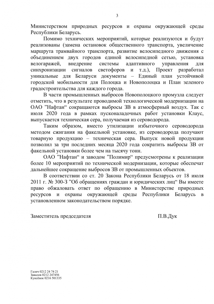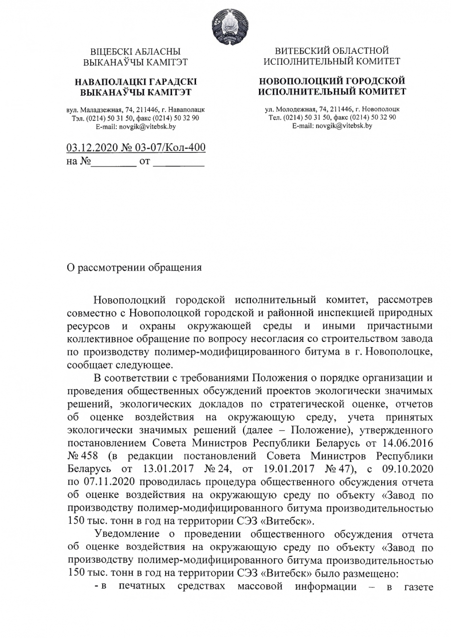 В рамках рассмотрения обращения в Новополоцкой городской и районной инспекции природных ресурсов и охраны окружающей среды 02.12.2020 состоялась встреча с тремя представителями заявителей, в том числе с автором петиции. В ходе встречи даны разъяснения по поступившим вопросам, касающихся состояния качества атмосферного воздуха г.Новополоцка, влияния промышленного узла города и планируемого к строительству объекта.