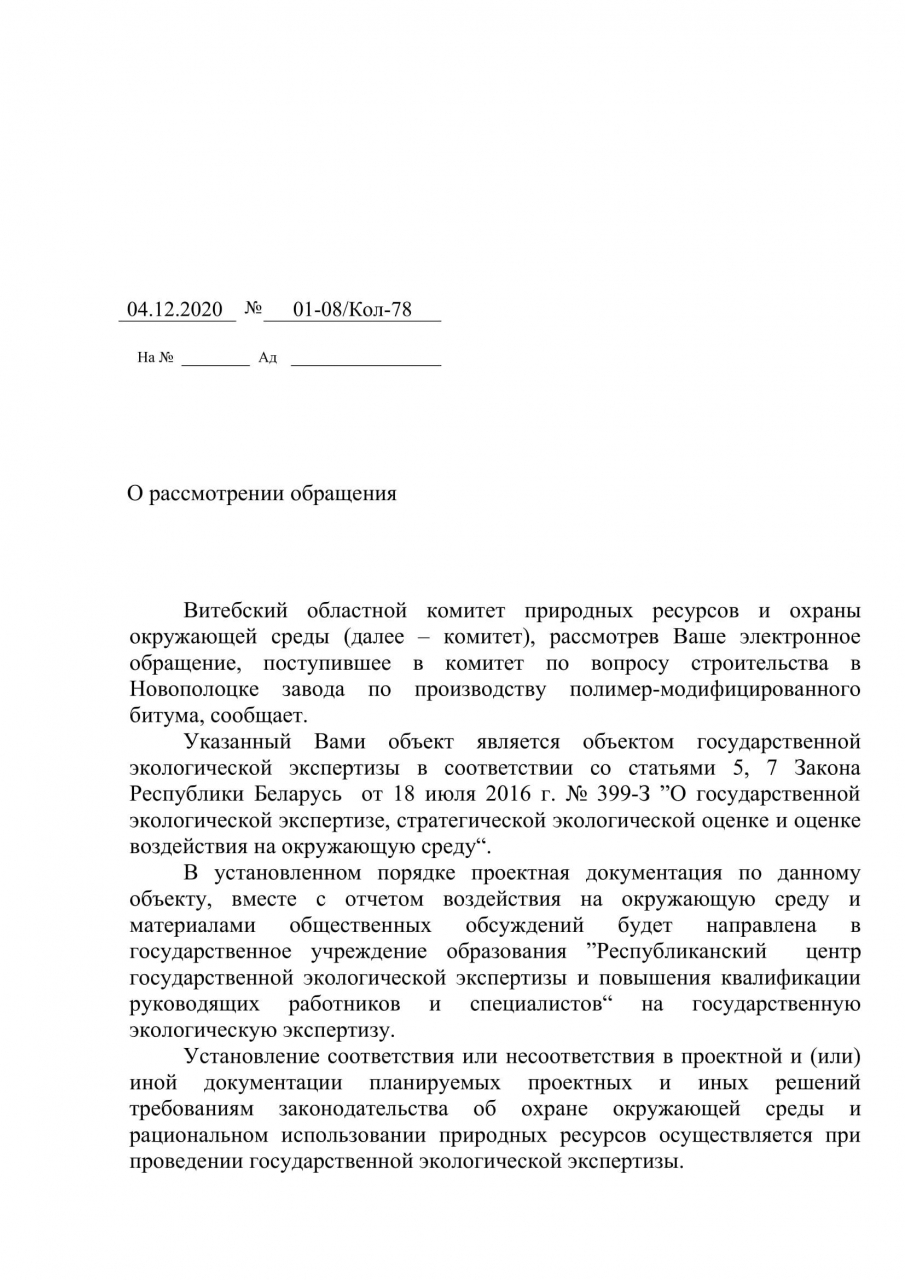 Таким образом, просим запретить строительство завода по производству полимер-модифицированного битума в г.Новополоцке. Просим защитить здоровье детей и всех жителей и гостей городов Новополоцка и Полоцка.