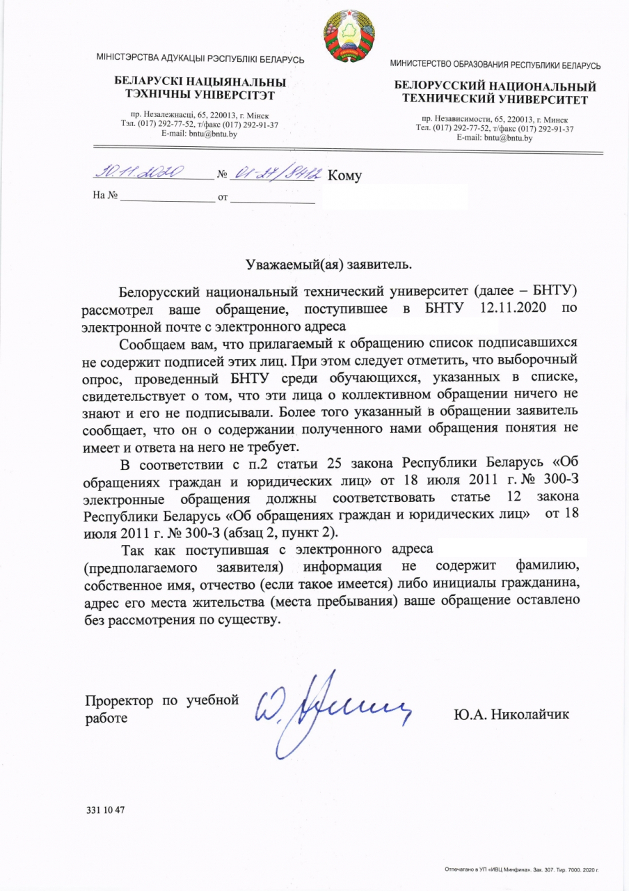 Обращение оставлено без рассмотрения, поскольку заявители, в том числе заявитель-автор, сообщили, что понятия не имеют о содержании обращения и ответа на него от БНТУ не требуют.