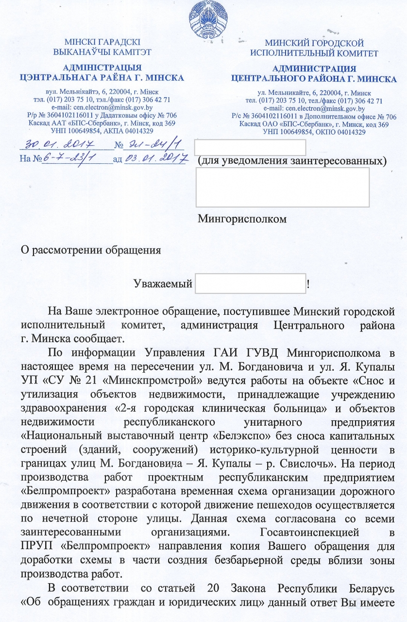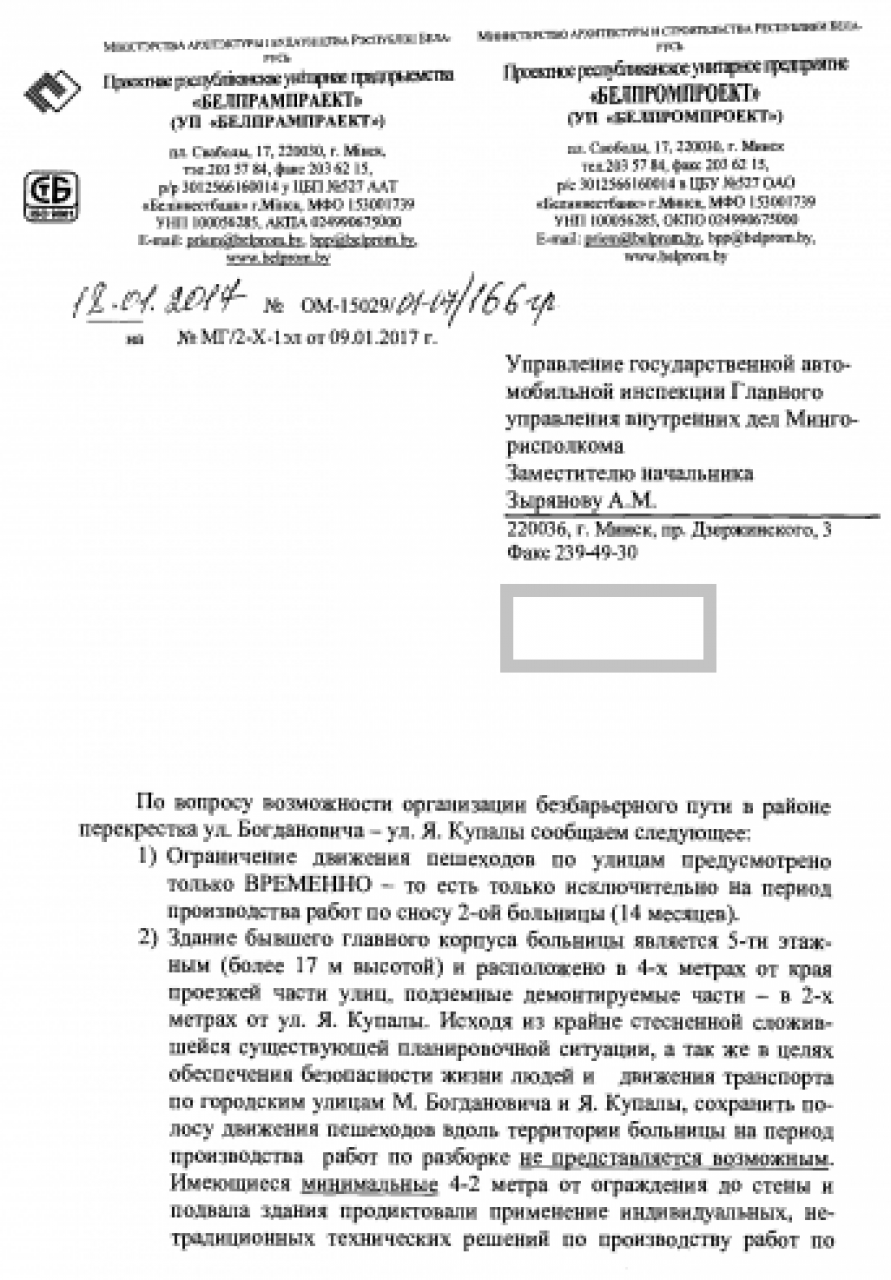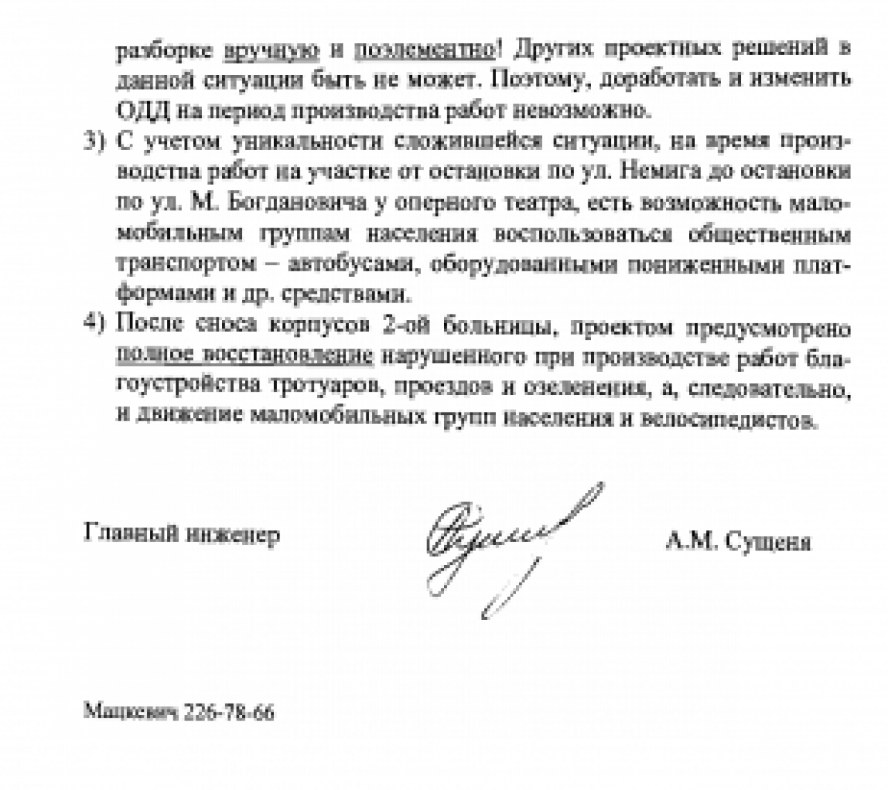 В связи с этим просим пояснить, каким образом предполагается организация безопасного движения вдоль ул. Богдановича перечисленных групп людей на время строительства.