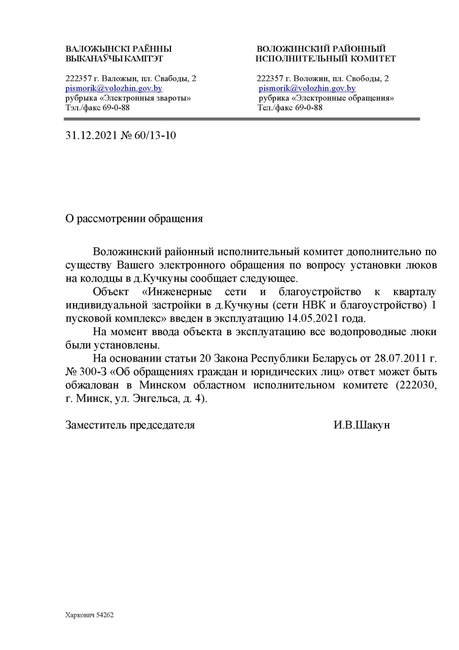Об открытых колодцах водопровода в д. Кучкуны, Раковского с/с