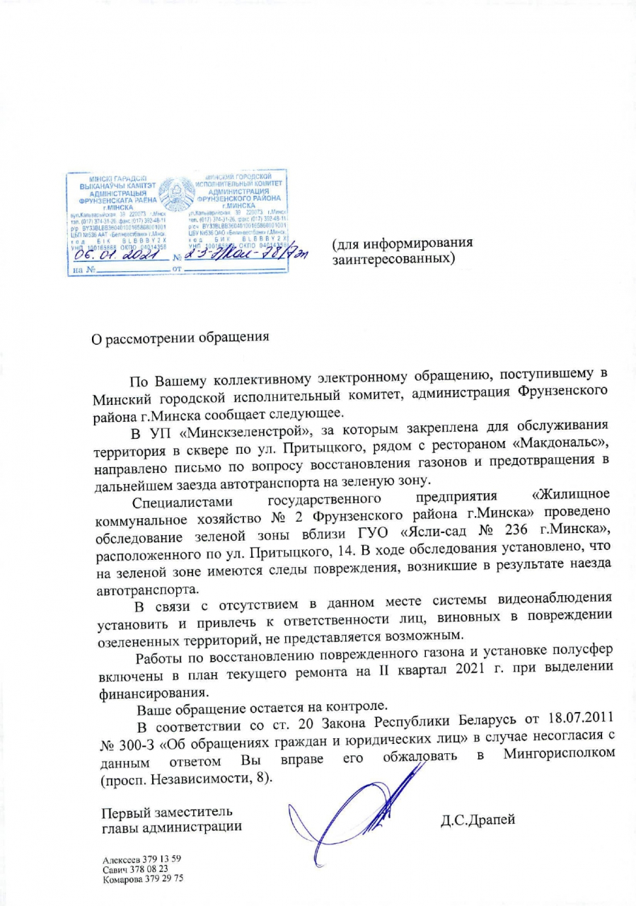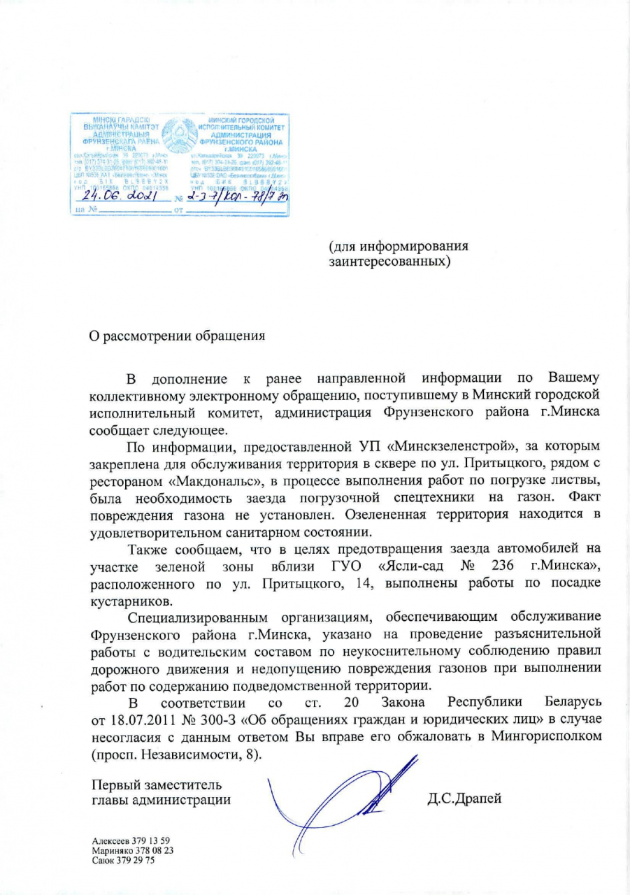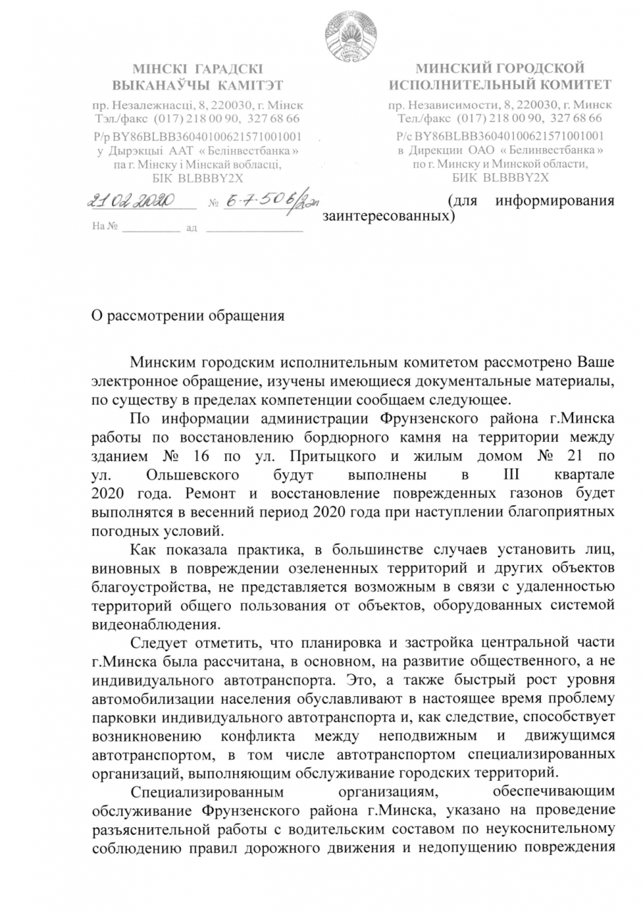 В ответе Мингорисполкома указано, что "Специализированным организациям, обеспечивающим обслуживание Фрунзенского р-на г.Минска, указано на проведение разъяснительной работы с водительским составом по неукоснительному соблюдению правил дорожного движения и недопущению повреждения газонов при выполнению работ по содержанию подведомственной территории. Еженедельно осуществляется объезд..... делаются соответствующие поручения..... есть ответственные исполнители... обсуждаются проблемные вопросы... обращение остается на контроле.... ".
