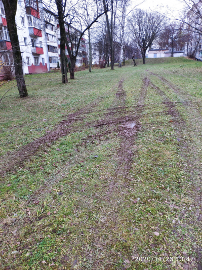 UPD. По информации УП "Минскзеленстрой" в процессе выполнения работ по погрузке листвы была необходимость заезда погрузочной спецтехники на газон. Факт повреждения газона не установлен.