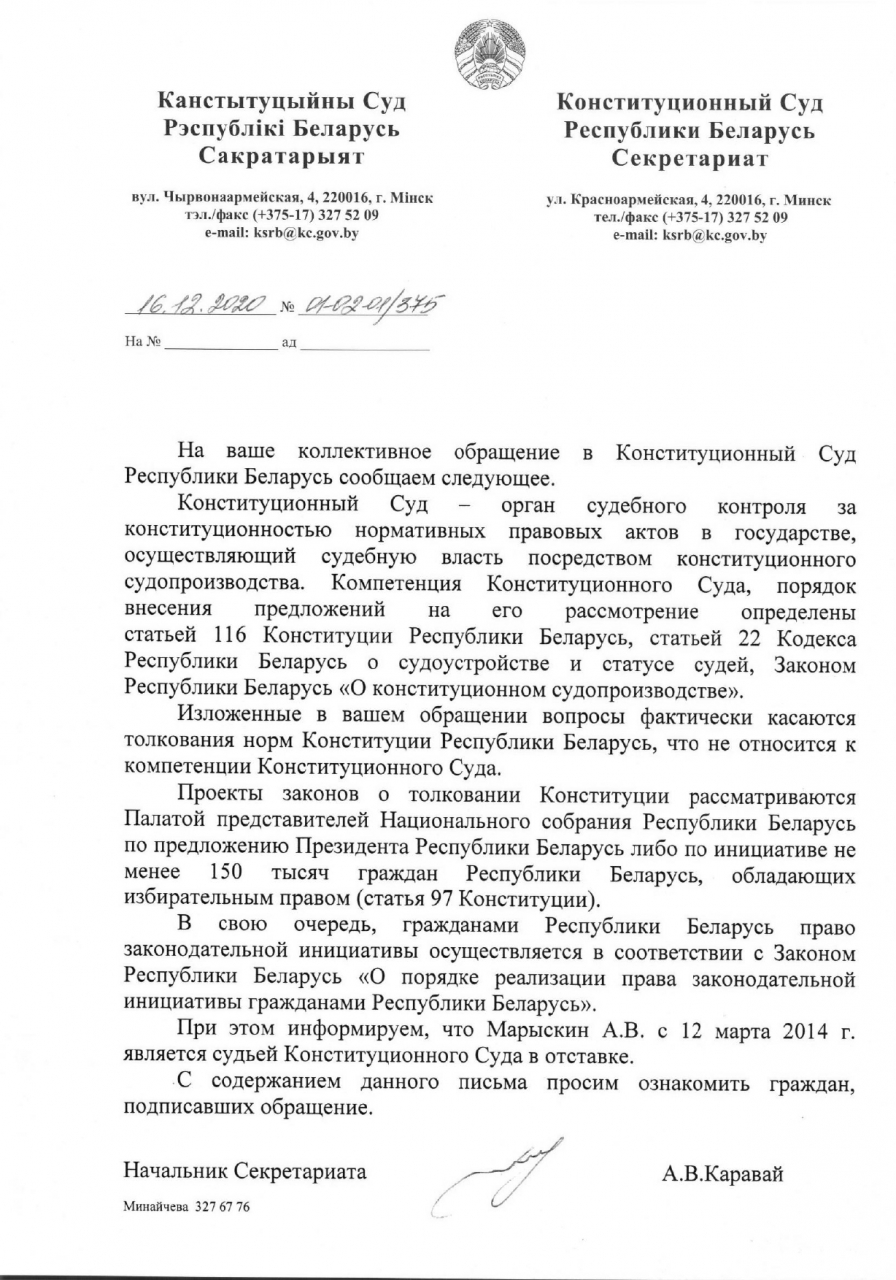 Таким образом, просим Конституционный суд публично высказать официальную позицию по вышеобозначенному вопросу, указав на личное мнение судьи Марыскина А.В., и поддержать вышеизложенное понимание норм Конституции Республики Беларусь.