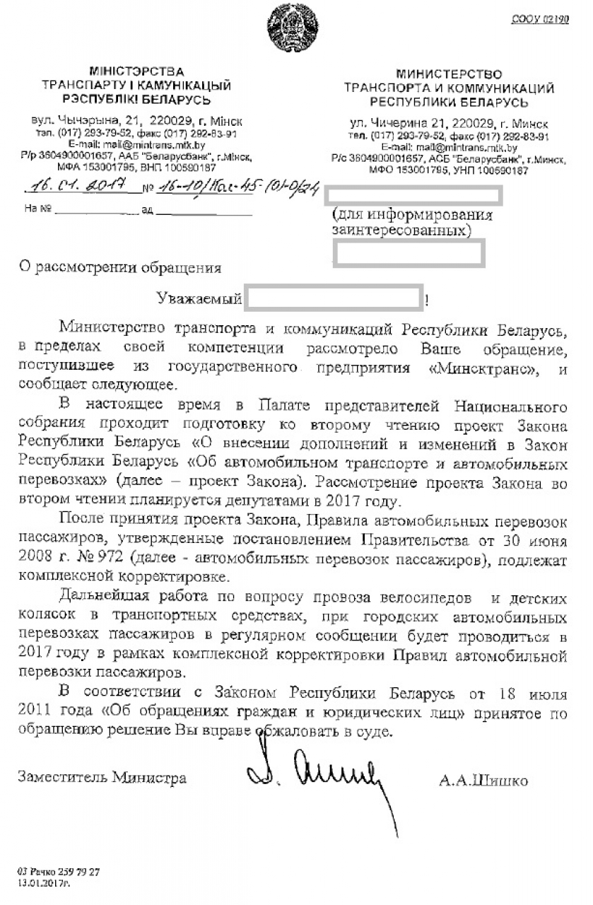 В открытых источниках в интернете мы ознакомились с ответом Минсктранса на обращение граждан о запрете провозить велосипеды в общественном транспорте №01-08/С-162 эл от 19.12.2016.