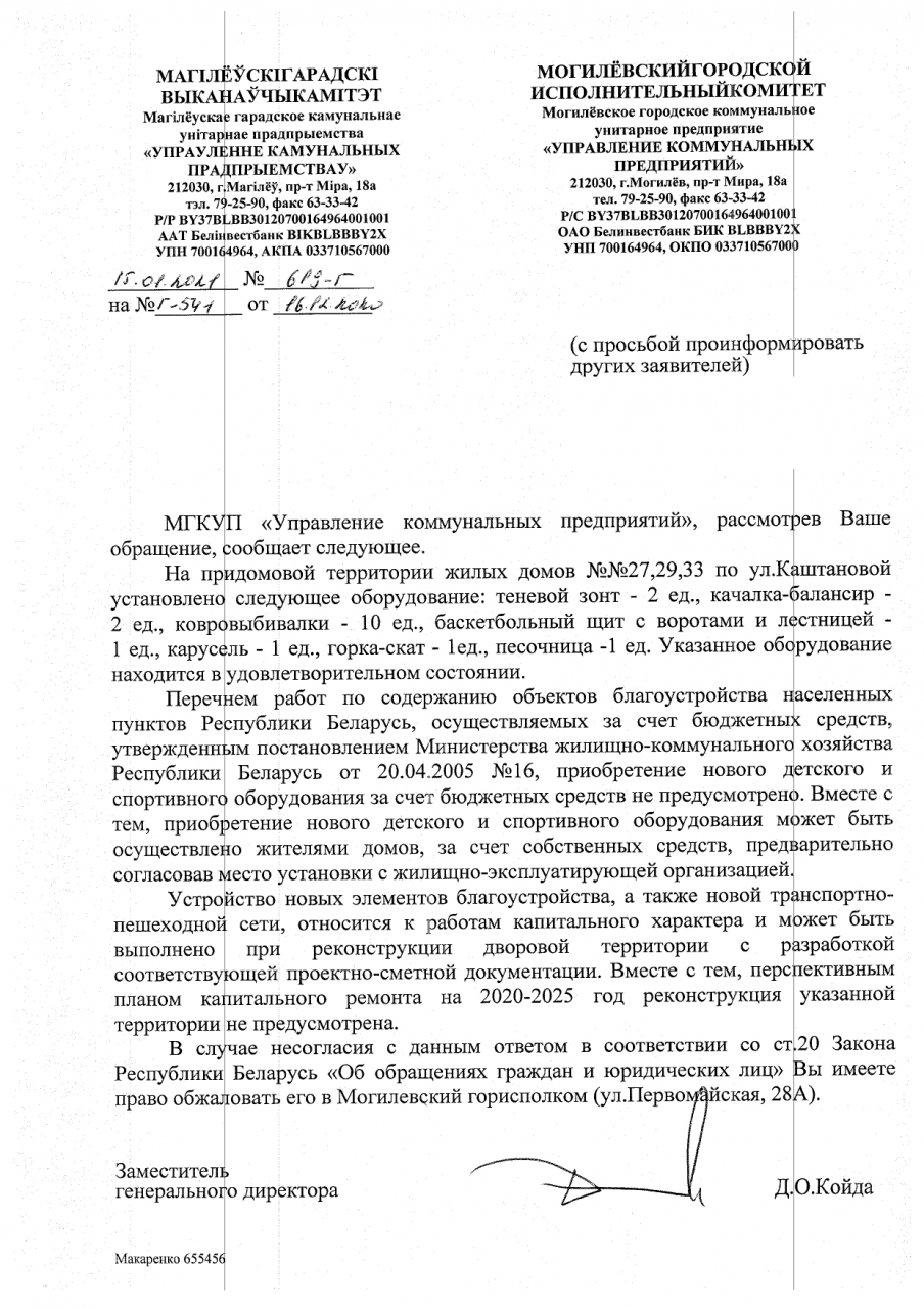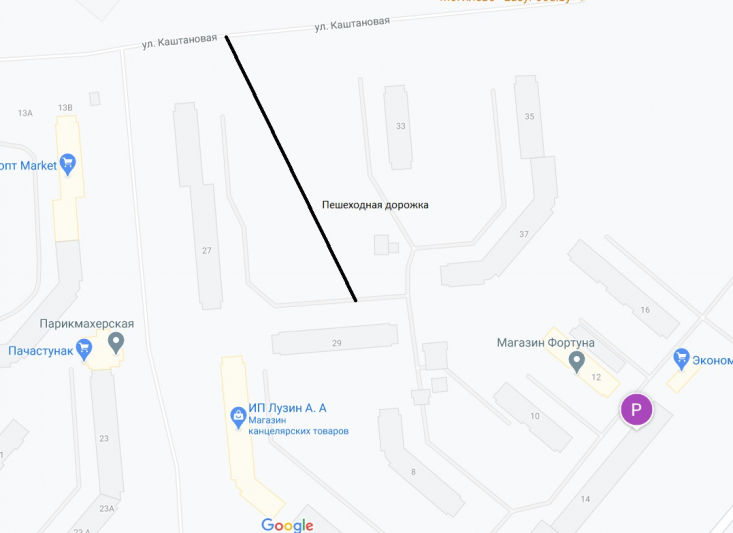 2) устройство пешеходной дорожки от пешеходной дорожки на ул.Каштановая в районе её прохождения вдоль домов №33 и №27 по ул.Каштановой и до дома №29 по ул.Каштановая в связи с высокой проходимостью людей, следующих из ГУО "Средняя школа № 40 г.Могилёва", Дворца гимнастики, магазинов и торговых центров, расположенных по адресу ул. Каштановая, 2, ул. Каштановая, 4 к месту своего жительства – вышеуказанным домам №14, №20, №10, №12, №16 по ул. Жемчужная и домов №37, №35 №33, №27, №29 по ул. Каштановой. Подробное расположение предлагаемого прохождения пешеходной дорожки указано на плане территории в Приложении 2.