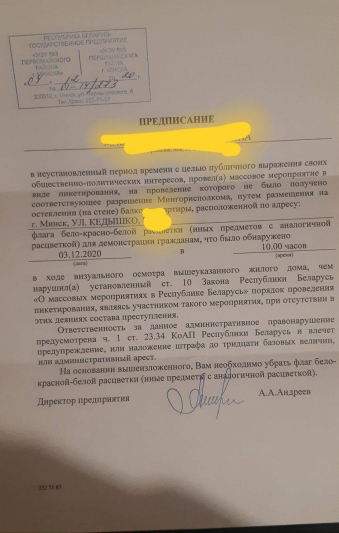 6 декабря 2020 года в сети интернет появился официальный документ государственного предприятия «ЖЭУ №3 Первомайского района города Минска» (Приложение 1) за исходящим номером 01-14 / 273 за 04 декабря 2020 года, в котором жителю квартиры, расположенной по улице Кедышко в городе Минске, предписывалось «убрать флаг бело-красно-белой расцветки (иные предметы с аналогичной расцветкой)».