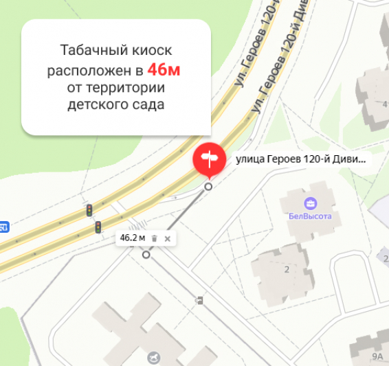 7 декабря 2020 года рядом с автобусной остановкой напротив дома по адресу Героев 120-й Дивизии, 2, установлен торговый объект для реализации табачных изделий. Его местоположение вызывает у нас серьёзные вопросы: