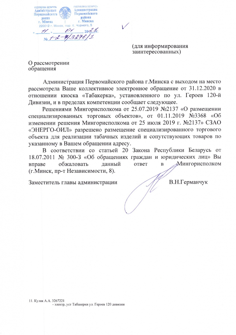 На основании изложенного просим Администрацию Первомайского района г.Минска перенести данный торговый объект в места наименьшего скопления детей в целях сохранения здоровья нации.