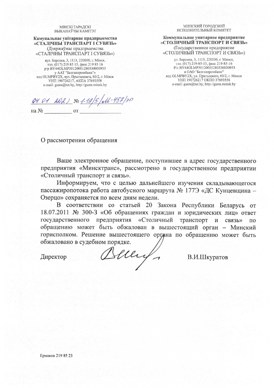 На устное обращение первого в списке заявителя настоящего обращения в ГП "Минсктранс", по горячей линии, ему ответили, что маршрут убирают из-за недостаточного поступления денежных средств с этого маршрута. Но как его можно сравнивать, если автобус №177э ходит только два раза в сутки?