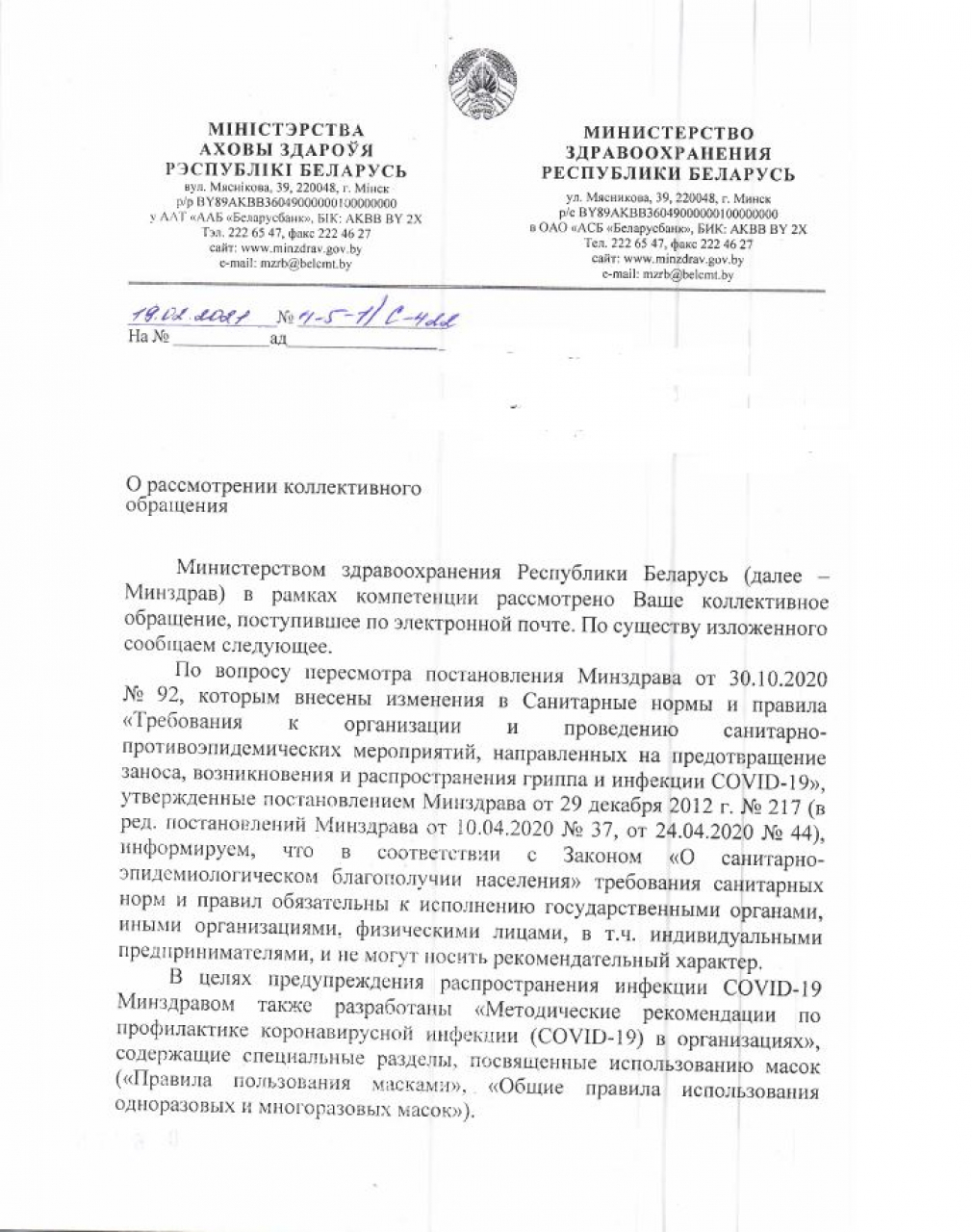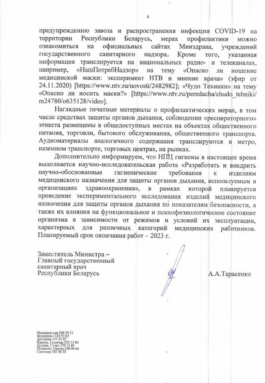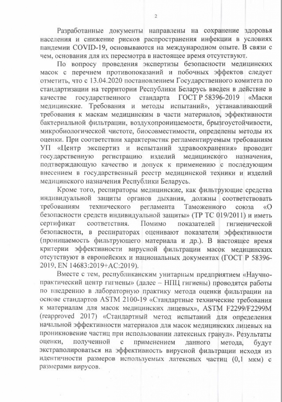 Создается впечатление, что тема эффективности и безопасности, а также правильного ношения и использования медицинских масок не находиться в сфере компетенции Министерства Здравоохранения РБ, а практика повсеместного и массового использования масок априори воспринимается как общественное благо.