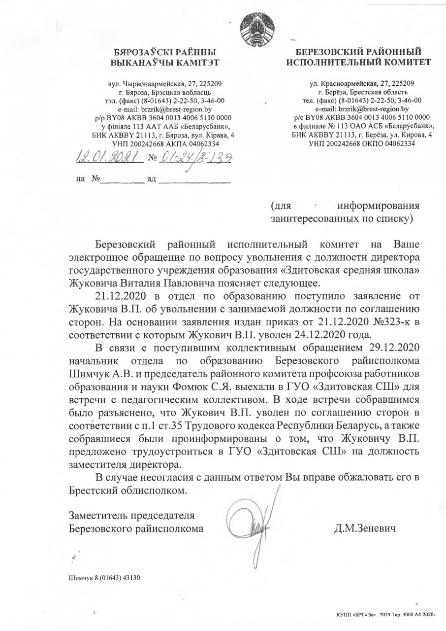 Обращаясь к Бартошу Сергею Ивановичу, председателю Березовского райисполкома, а также другим лицам, влияющим на принятие решения, мы настаиваем на отмене инициативы по увольнению директора Здитовской средней школы Виталия Павловича Жуковича.