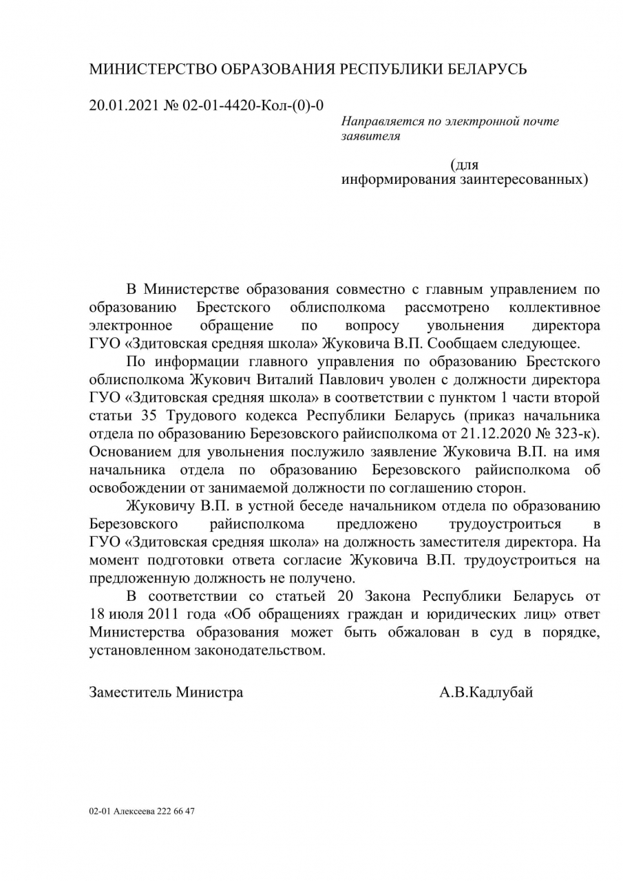 18 декабря 2020 года нам, заявителям настоящего обращения, стало известно, что принято решение об увольнении директора ГУО "Здитовская средняя школа" Жуковича Виталия Павловича.