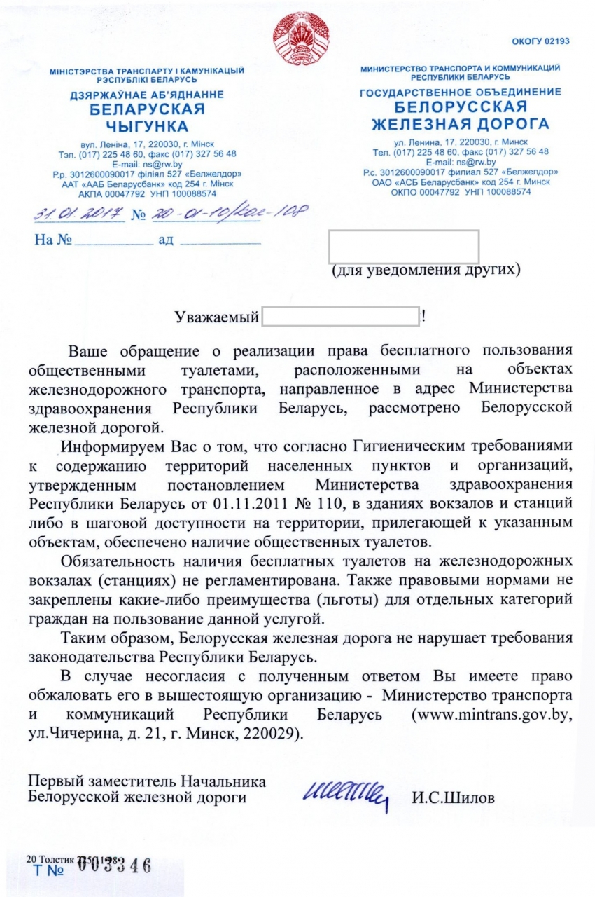 Уважаемое министерство здравоохранения! Я и ниже подписавшиеся, просим вас рассмотреть ситуацию с платными туалетами на вокзалах для пассажиров в пределах вашей компетенции и по сути проблемы в целом. Просим вас руководствоваться законом о здравоохранении РБ и других нормативно-правовых нормах и актах о человека и его здоровья.