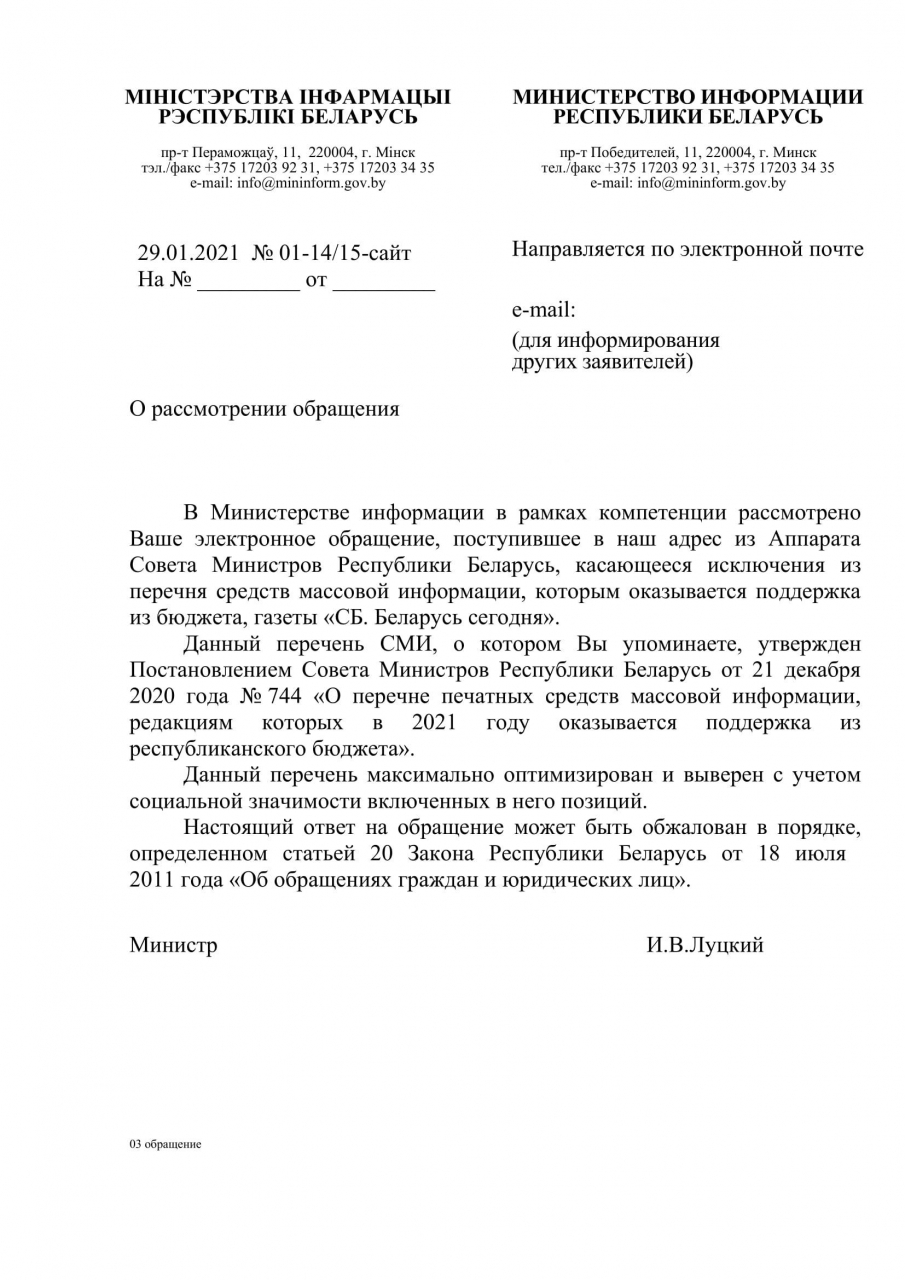 Просим исключить из перечня средств массовой информации, которым будет оказана поддержка из бюджета, согласно постановлению Совета Министров № 744 от 21 декабря 2020, газету, учреждённую Администрацией Президента "СБ.Беларусь сегодня".