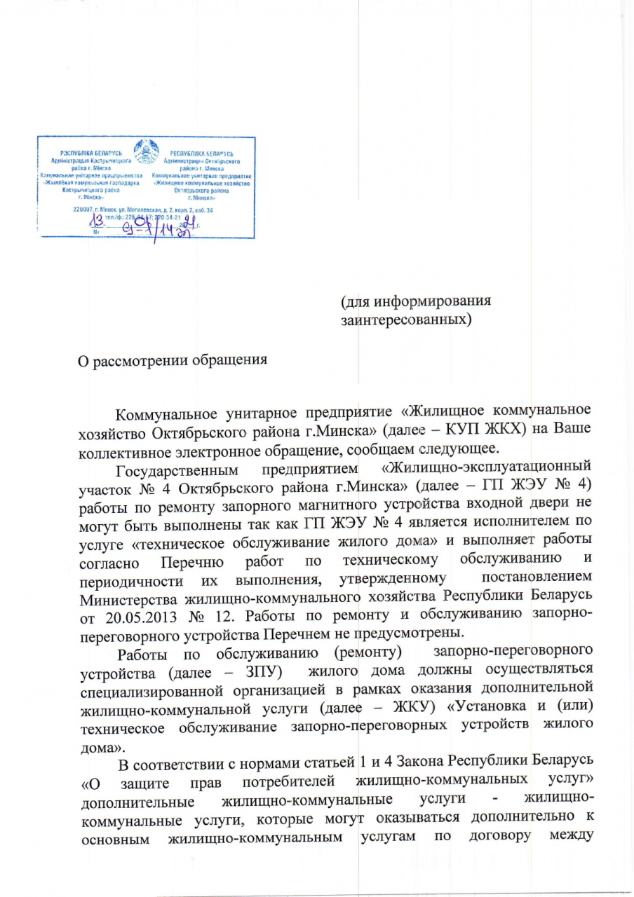 В жилом доме, расположенном по адресу г.Минск, ул.Пуховичская, 10, во втором подъезде не работает (вышло из строя) магнитное запорное устройство входной двери в подъезд.
