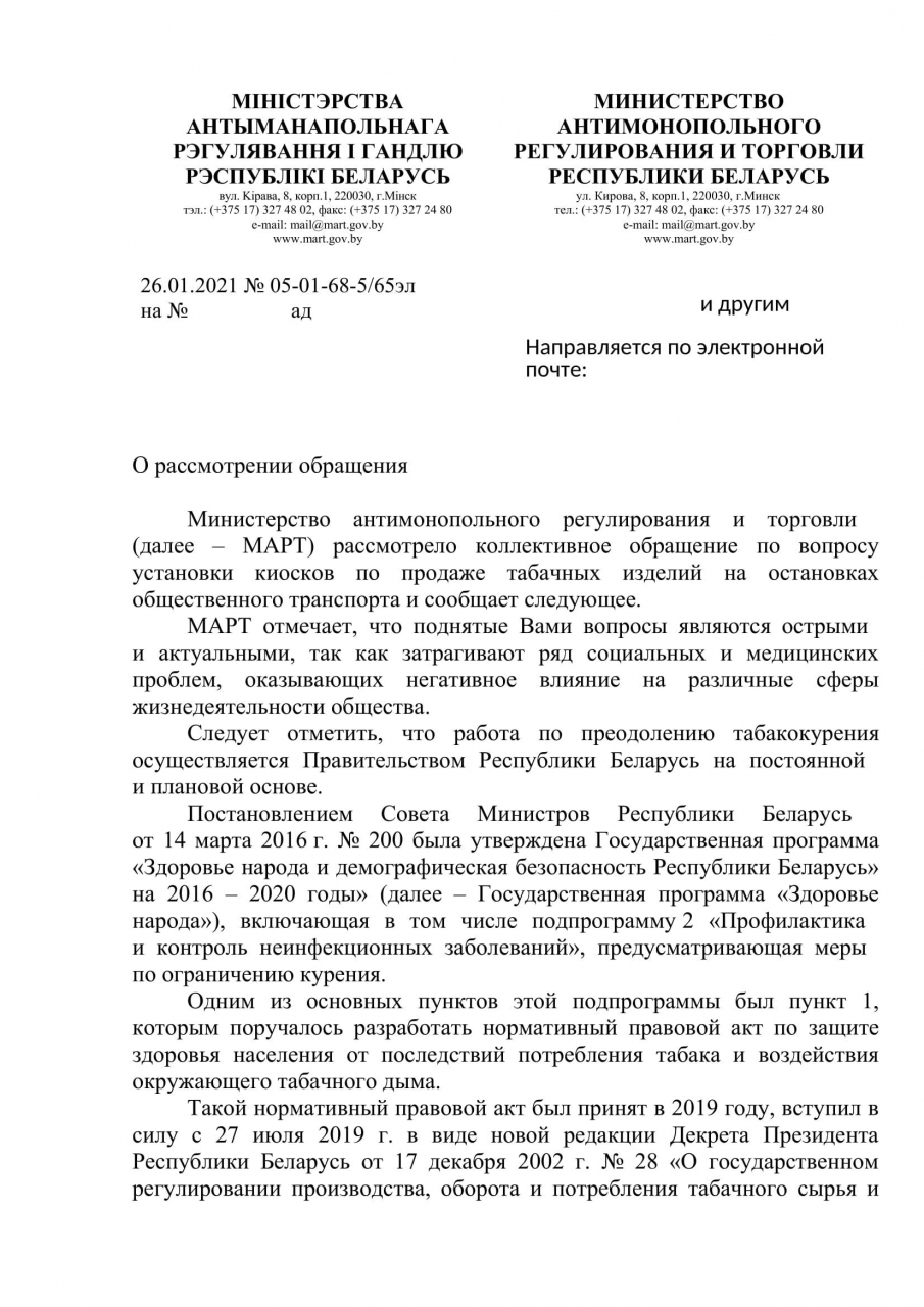 Мы, граждане Республики Беларусь, выражаем несогласие с установкой на улицах городов дополнительных точек продаж табачных изделий.