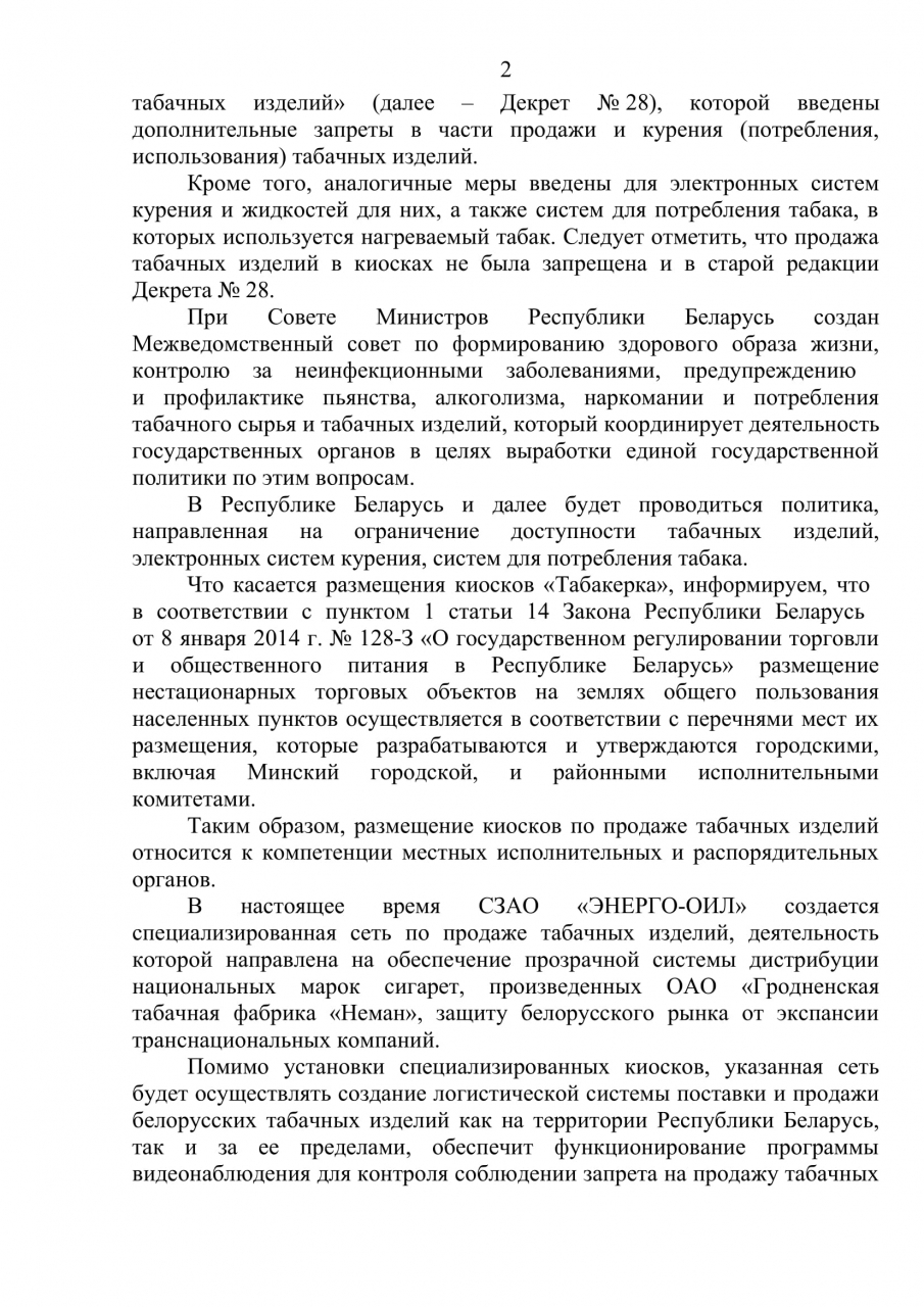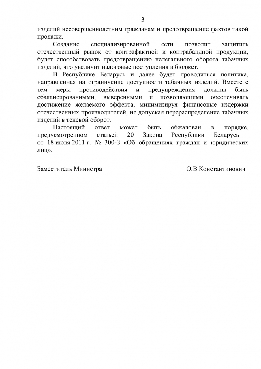 Размещение киосков по продаже табачных изделий относится к компетенции местных исполнительных и распорядительных органов. Создание специализированной сети позволит защитить отечественный рынок от контрафактной и контрабандной продукции, будет способствовать предотвращению нелегального оборота табачных изделий, что увеличит налоговые поступления в бюджет. В Республике Беларусь и далее будет проводиться политика, направленная на ограничение доступности табачных изделий.