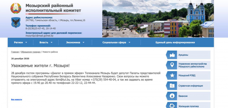 1. опубликовать запись эфира программы «Диалог в прямом эфире» от 28 декабря 2020 г. с участием депутата В.А.Назаренко на сайте телеканала "Мозырь".