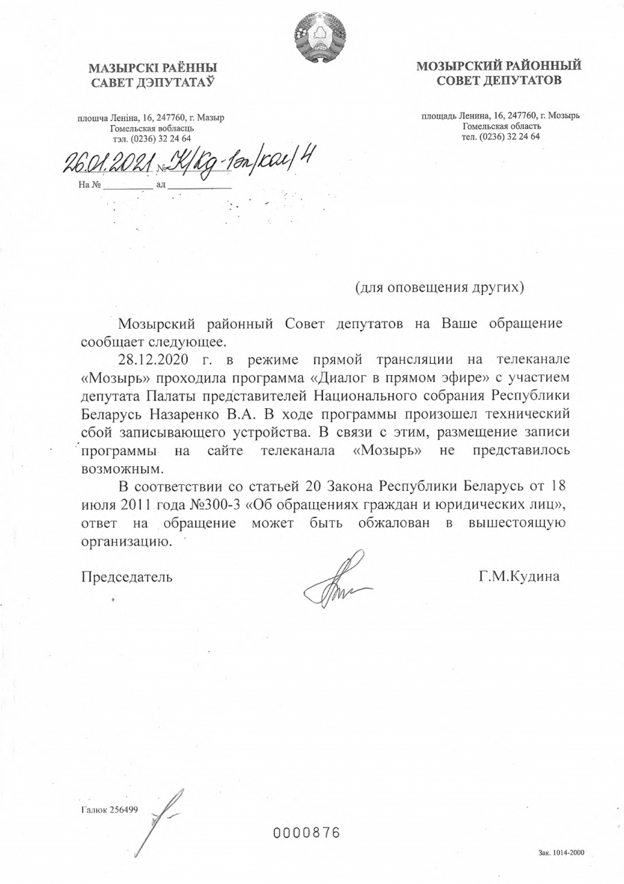 2. В случае, если запись не размещена на сайте телеканала по приказу отдела идеологической работы, культуры и по делам молодёжи Мозырского райисполкома вследствие некорректных высказываний депутата в эфире, просим расценивать это как выражение потери доверия к депутату со стороны исполнительной власти, а следовательно просим в очередной раз поднять вопрос отзыва депутата В.А.Назаренко.