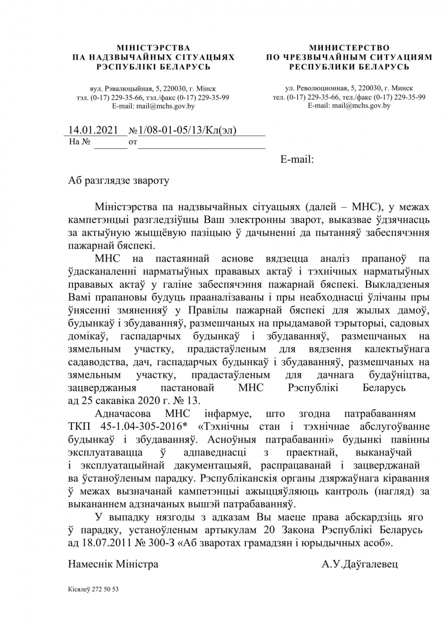 Выкладзеныя прапановы будуць прааналізаваны і пры неабходнасці ўлічаны пры ўнясенні змяненняў у Правілы пажарнай бяспекі для жылых дамоў, будынкаў і збудаванняў, размешчаных на прыдамавой тэрыторыі, садовых домікаў, гаспадарчых будынкаў і збудаванняў, размешчаных на зямельным участку, прадастаўленым для вядзення калектыўнага садаводства, дач, гаспадарчых будынкаў і збудаванняў, размешчаных на зямельным участку, прадастаўленым для дачнага будаўніцтва.
