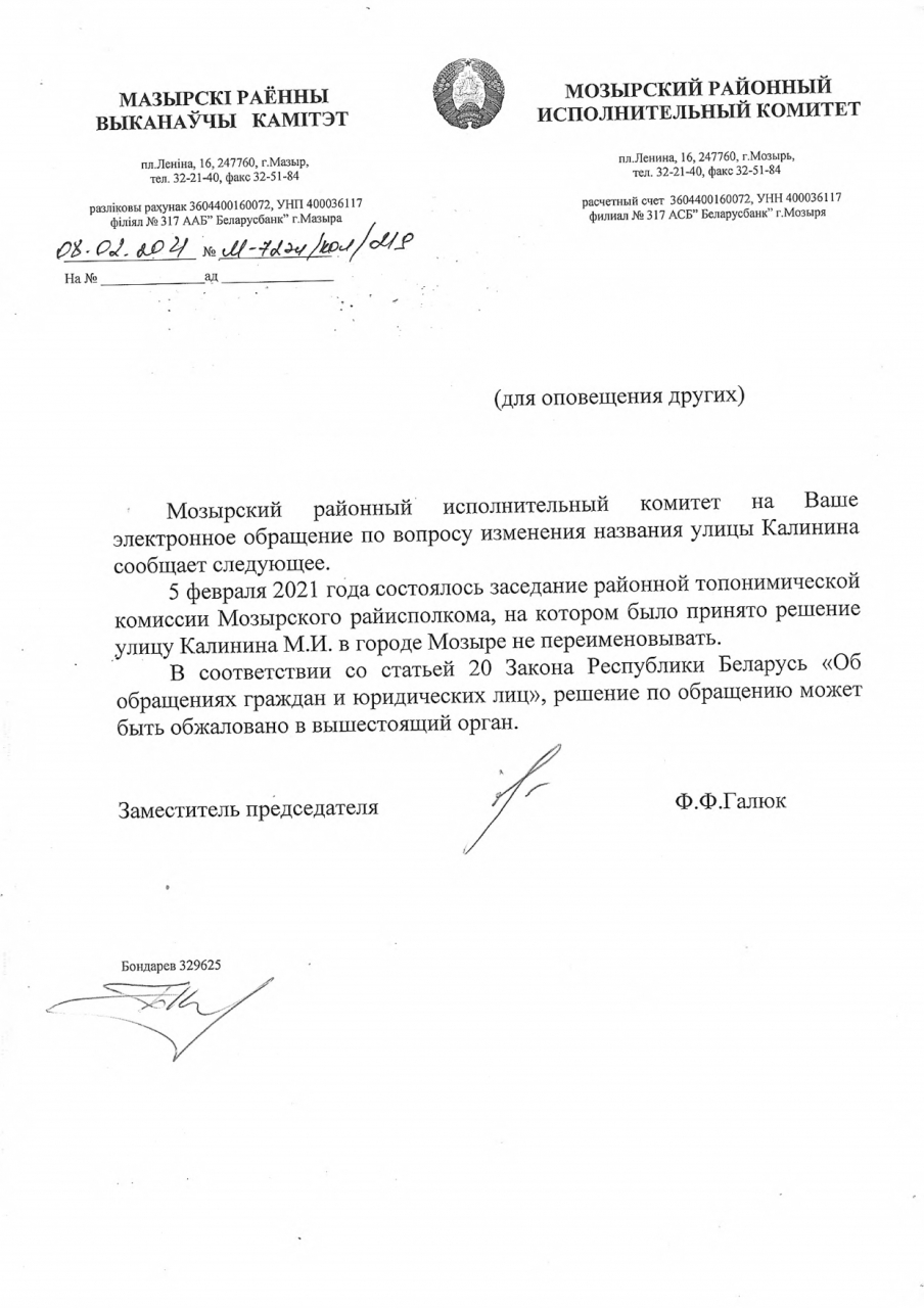 Руководствуясь ст. 20 Закона «О наименованиях географических объектов», который предусматривает, что предложения о присвоении наименований составным частям населённых пунктов и их переименовании могут вноситься местными Советами депутатов, исполнительными и распорядительными органами, предлагаем внести и рассмотреть предложение о переименовании нынешней улицы Калинина и возвращении ей её исторического названия, ведь жить на улице в честь человека, который принёс много зла жителям Беларуси, это не нормально.