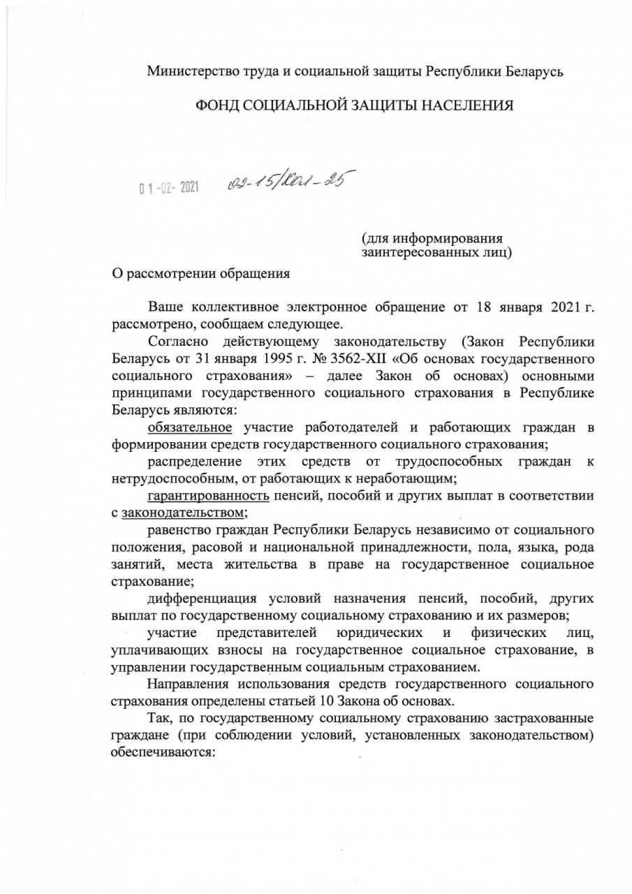 1) предоставления отчёта Фондом социальной защиты населения о точном количестве собранных денежных средств в разрезе формирования республиканского бюджета и отдельно местного бюджета Гомельской области и, в частности, г.Гомеля, в форме налога с каждого человека в размере 1%, с юридических лиц в размере 35%,