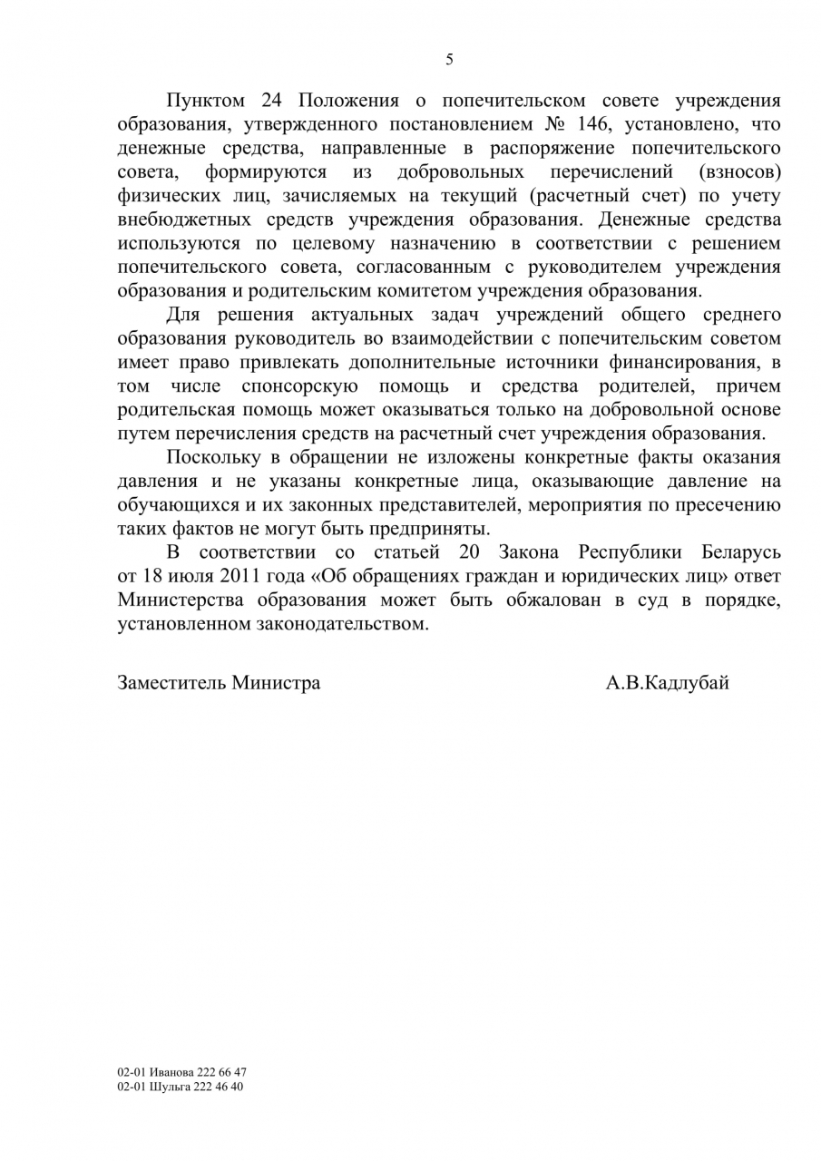 5) также требуем пояснений по поводу продолжающегося сбора денежных средств в детских садах, школах, спортивных школах, учреждений профессионально-технического образования и других государственных образовательных учреждениях в качестве «поборов». Поясняем, что в вышеуказанных учреждениях это представляют, как добровольные взносы на внебюджетный счет. Однако добровольно – это изъявление доброй воли! А когда начинается запугивание и шантаж какими-либо негативными действиями и последствиями в отношении наших детей и нас, их родителей, в случае неперечисления или не передачи определенных сумм денежных средств или сбора денежных средств на те или иные нужды учреждения образования – это уже приобретает форму «поборов». Так вот вторая форма, чаще всего, уже можно сказать на постоянной основе, присутствует практически во всех дошкольных и школьных учреждениях любого вида образования и развития, где обучаются дети заявителей настоящего обращения.