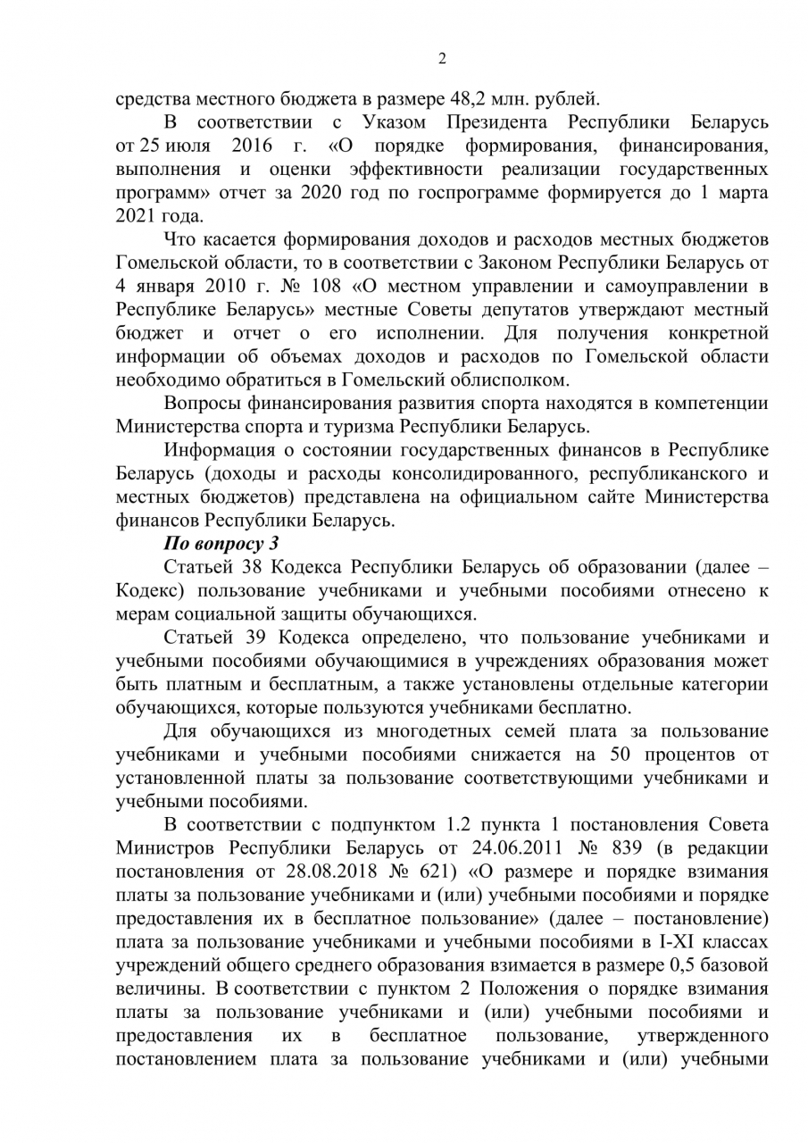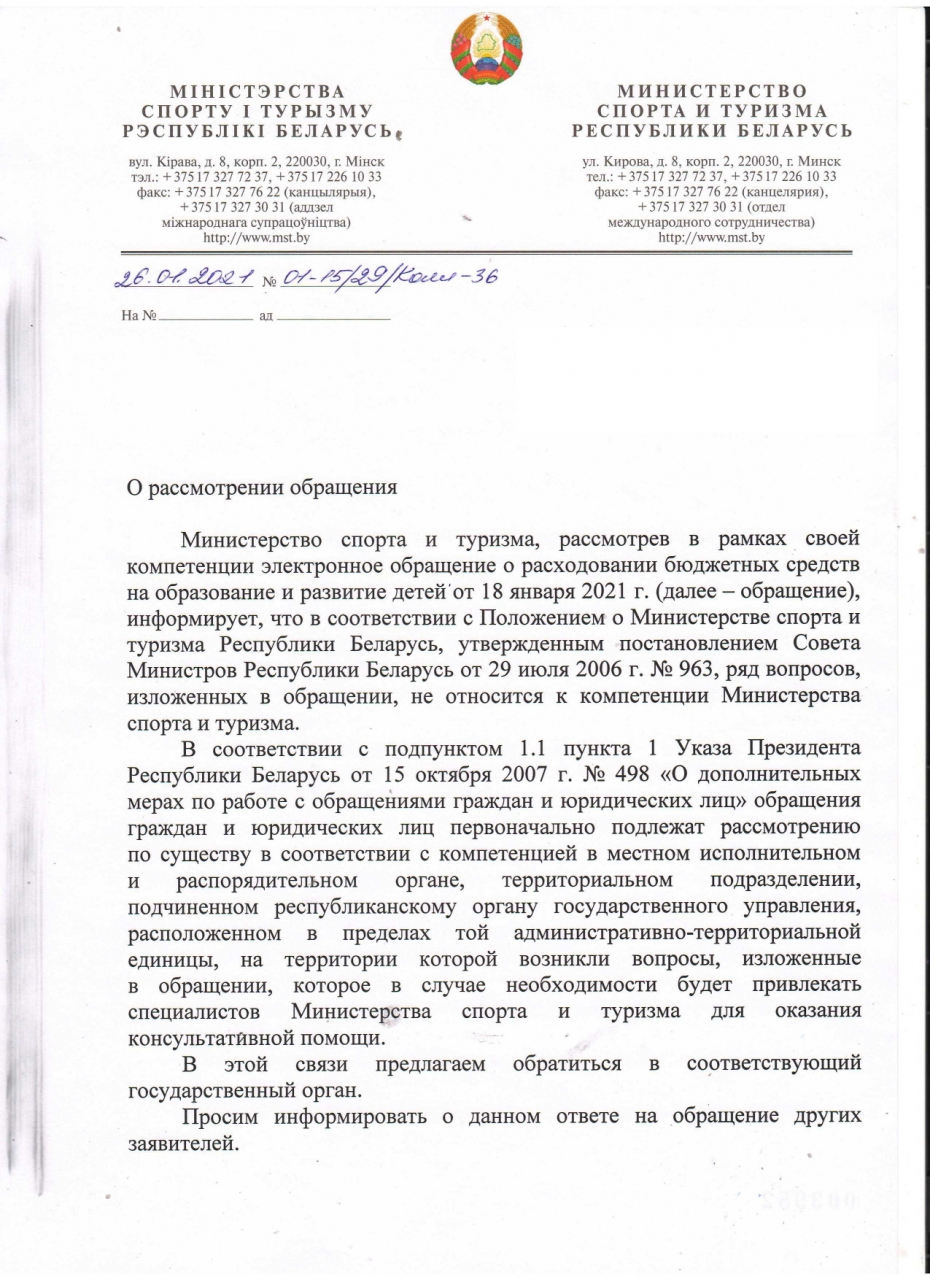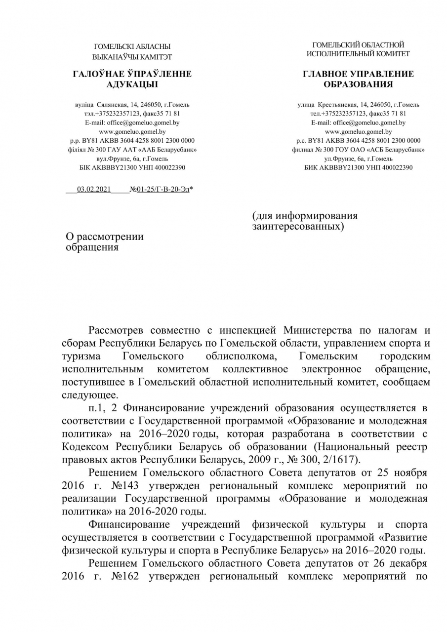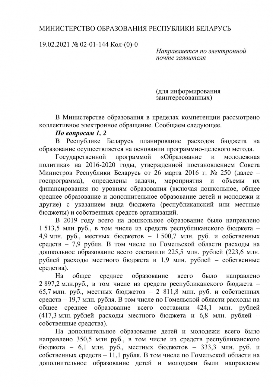 1) предоставление отчёта Министерством образования, а также Министерством спорта и туризма Республики Беларусь в формировании и распределении бюджетных средств, о точном количестве собранных денежных средств в разрезе формирования республиканского бюджета и отдельно местного бюджета Гомельской области и, в частности, г.Гомеля, на образование и развитие наших детей, собранных в форме налогов с каждого человека, таких как подоходный в размере 13% с каждого работающего человека, 16%, 9% и иные по категориям с юридических лиц, налога на добавленную стоимость в размере 20%, налога на прибыль в размере 6%, 12% и 25% соответственно по категориям, и других налогов, а также формирующих бюджет различных штрафов и пошлин;