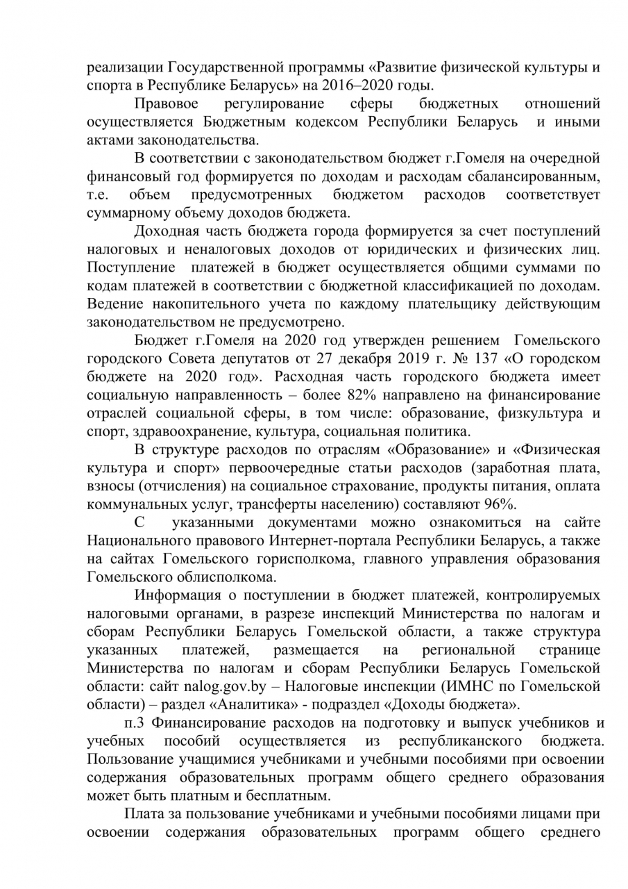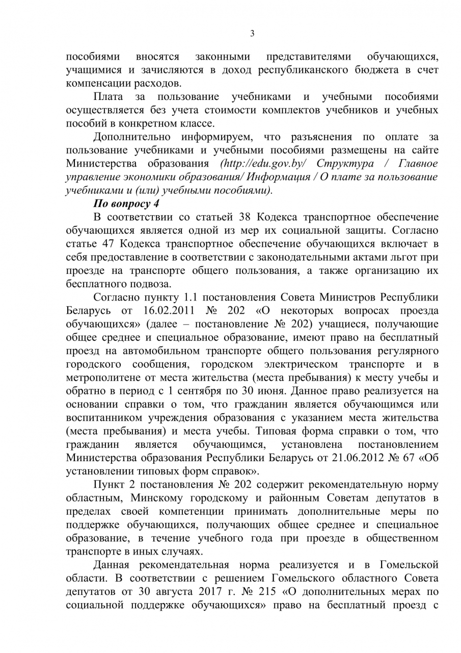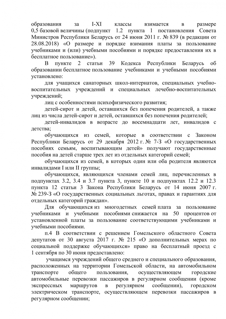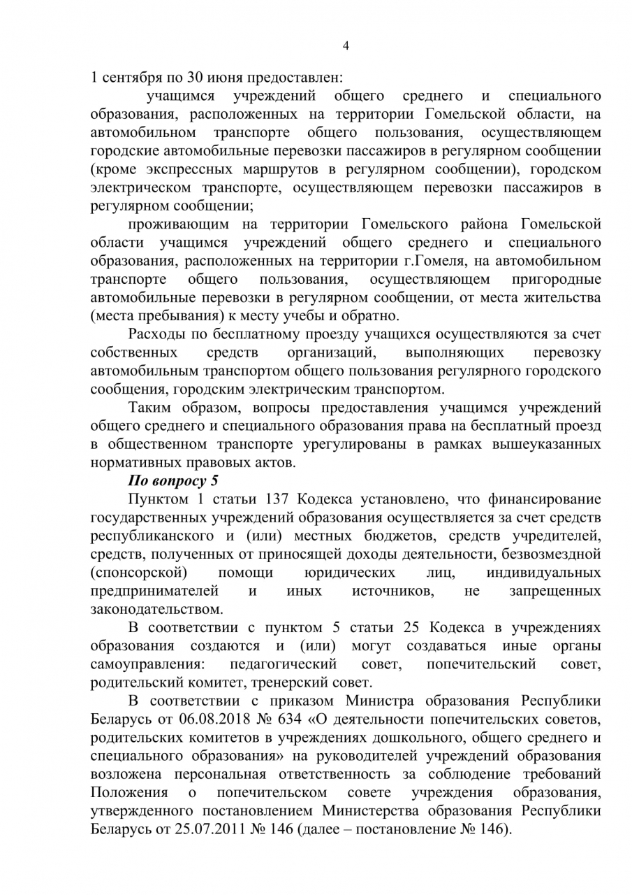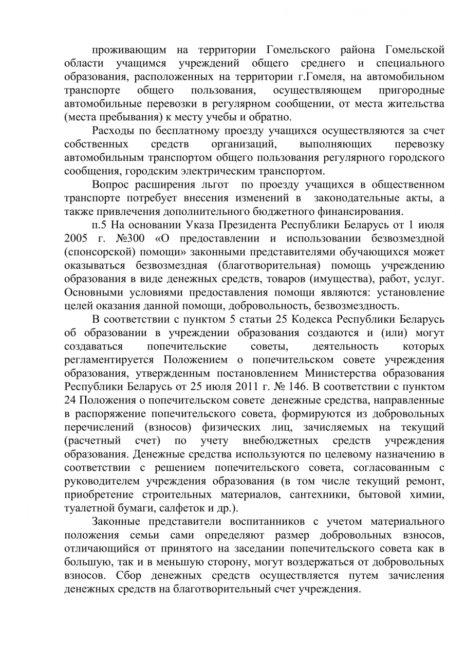 4) пояснения по поводу оплаты проезда в общественном транспорте в период с 01 июля по 31 августа каждого года с детей школьного возраста от 7 лет до 16 лет г.Гомеля конкретно, которые обучаются в средних государственных общеобразовательных учреждениях, и, по объективным причинам не имеют собственных денег, в то время как в г.Минске дети той же категории и того же возраста не оплачивают проезд в общественном транспорте и с них не требуют оплаты за проезд;