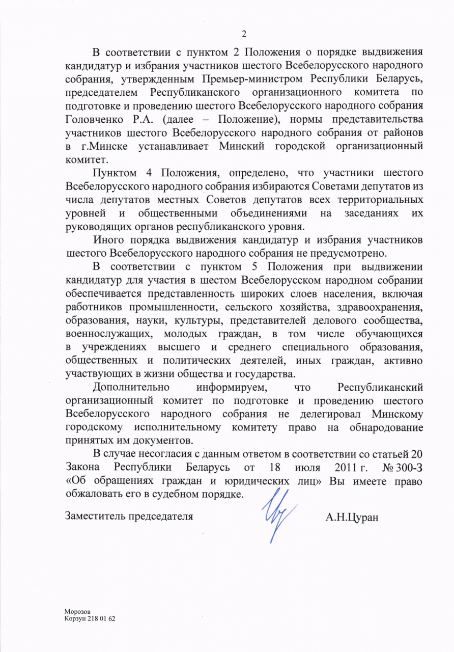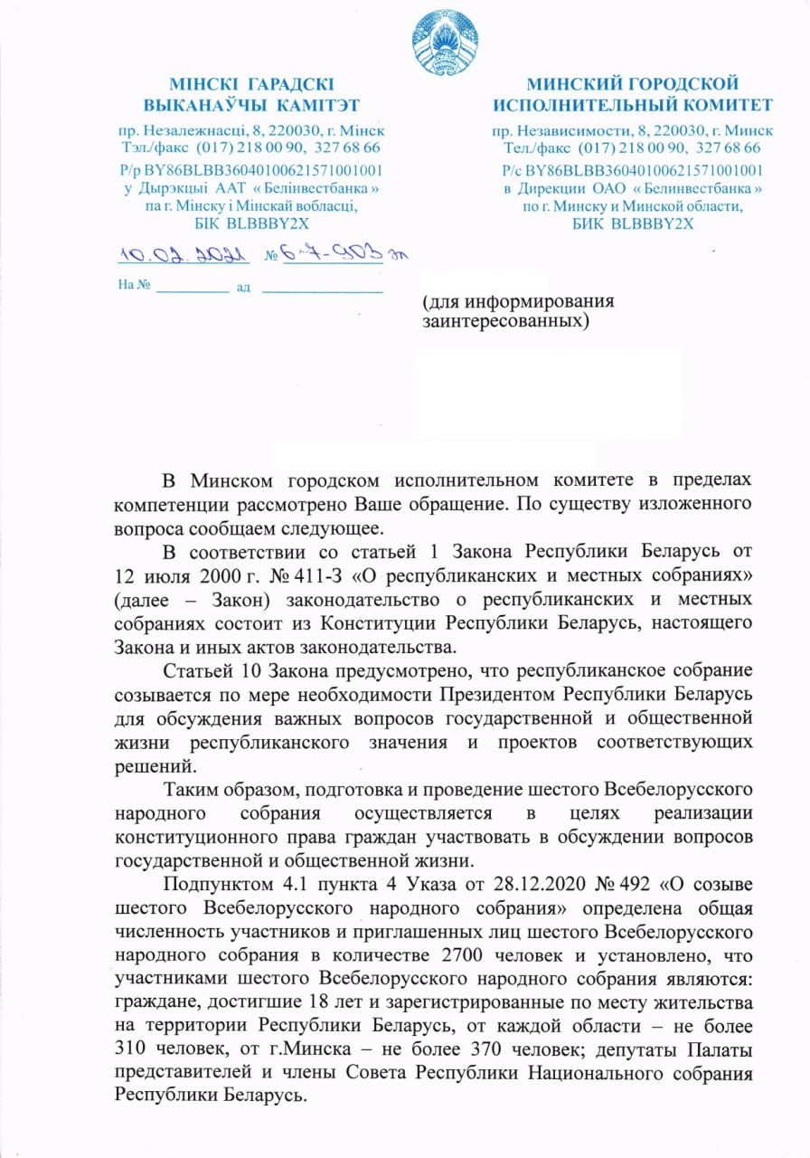 В ответе Минского горисполкома от 06.01.2021 № 6-7-9423/2эп указано, что подготовка и проведение шестого Всебелорусского народного собрания организованы в соответствии с Указом Президента Республики Беларусь от 28.12.2020 № 492 «О созыве шестого Всебелорусского народного собрания» (далее по тексту – Указ № 492), Положением о порядке выдвижения кандидатур и избрания участников шестого Всебелорусского народного собрания, утвержденным Премьер-министром Головченко Р.А. (далее по тексту – Положение о порядке выдвижения кандидатур и избрания участников собрания), а также Законом Республики Беларусь от 12.07.2000 №411-З «О республиканских и местных собраниях» (далее по тексту – Закон «О республиканских и местных собраниях»).