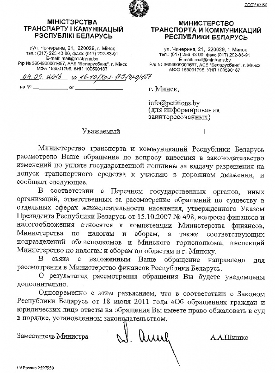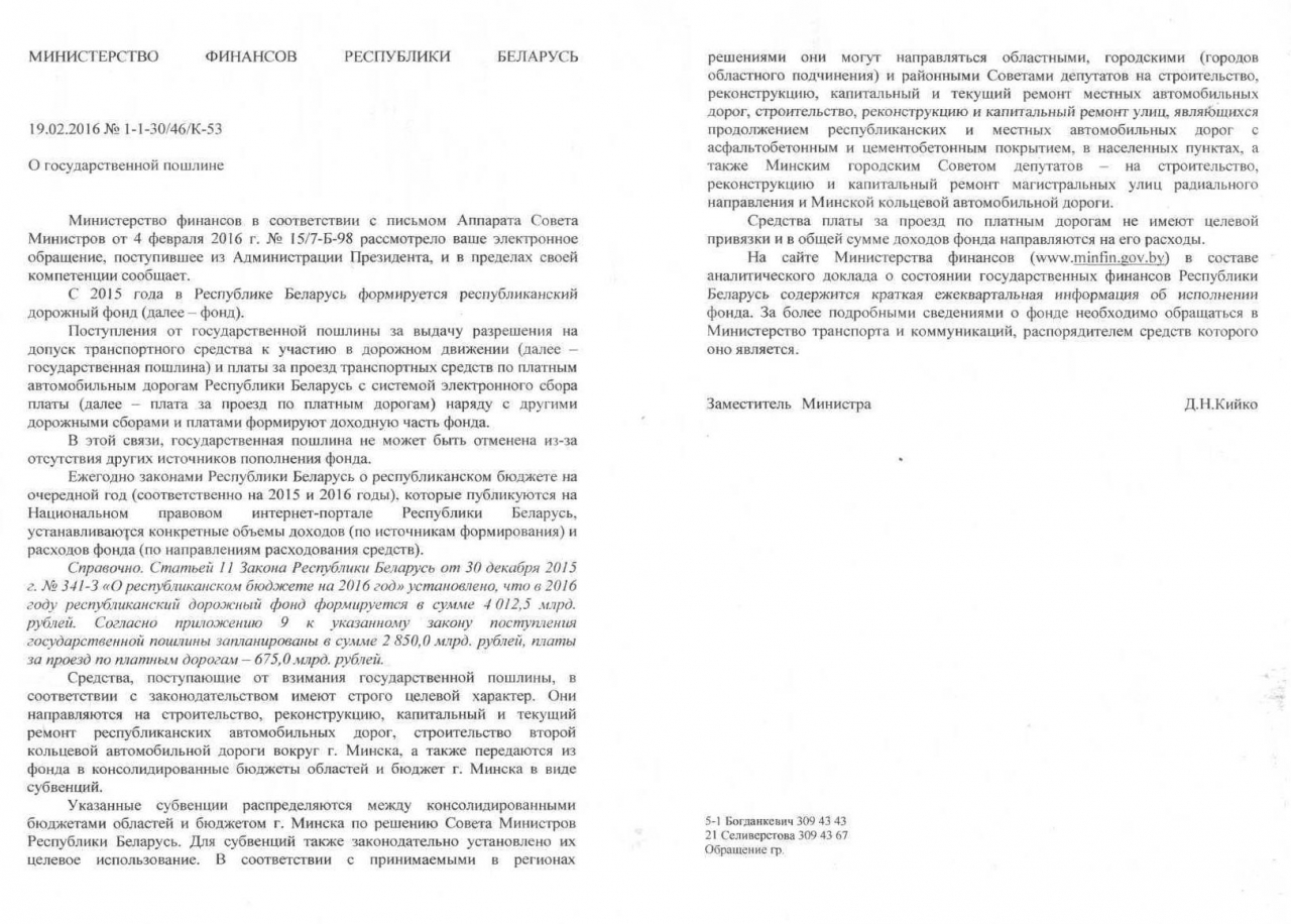 Средства, поступающие от взимания государственной пошлины, направляются на строительство, реконструкцию, капитальный и текущий ремонт республиканских автомобильных дорог, строительство второй кольцевой автомобильной дороги вокруг г. Минска, строительство, реконструкцию, капитальный и текущий ремонт местных автомобильных дорог, улиц с асфальтобетонным и цементобетонным покрытием.
