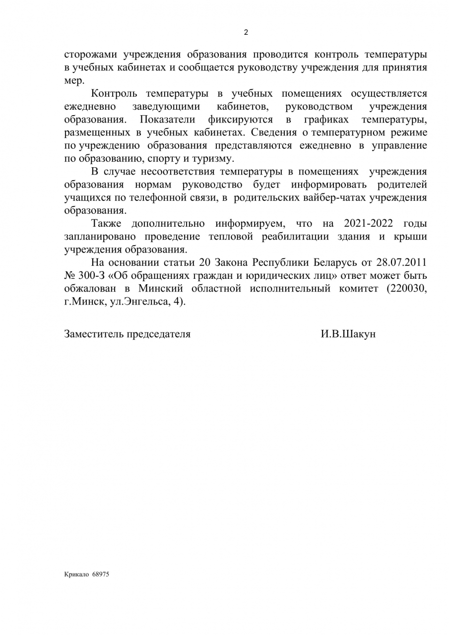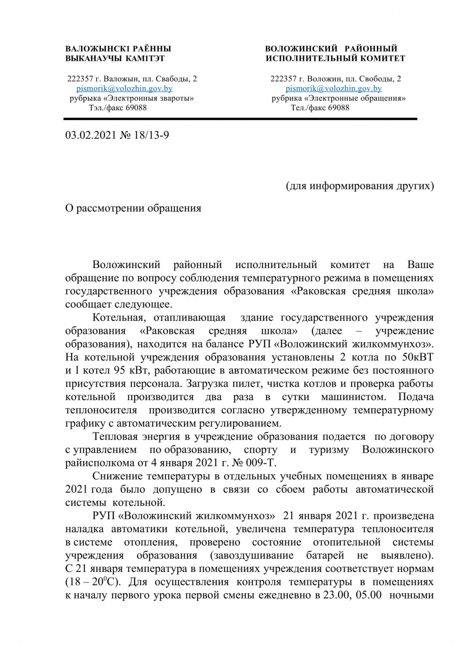 Мы, родители учеников Раковской средней школы и иные заинтересованные граждане, сообщаем о том, что в указанной школе имеет место регулярное несоблюдение санитарных норм и правил “Требования для учреждений общего среднего образования" (далее - СанПиН) в части оптимальных параметров температуры воздуха в помещениях данных учреждений в холодный период года.