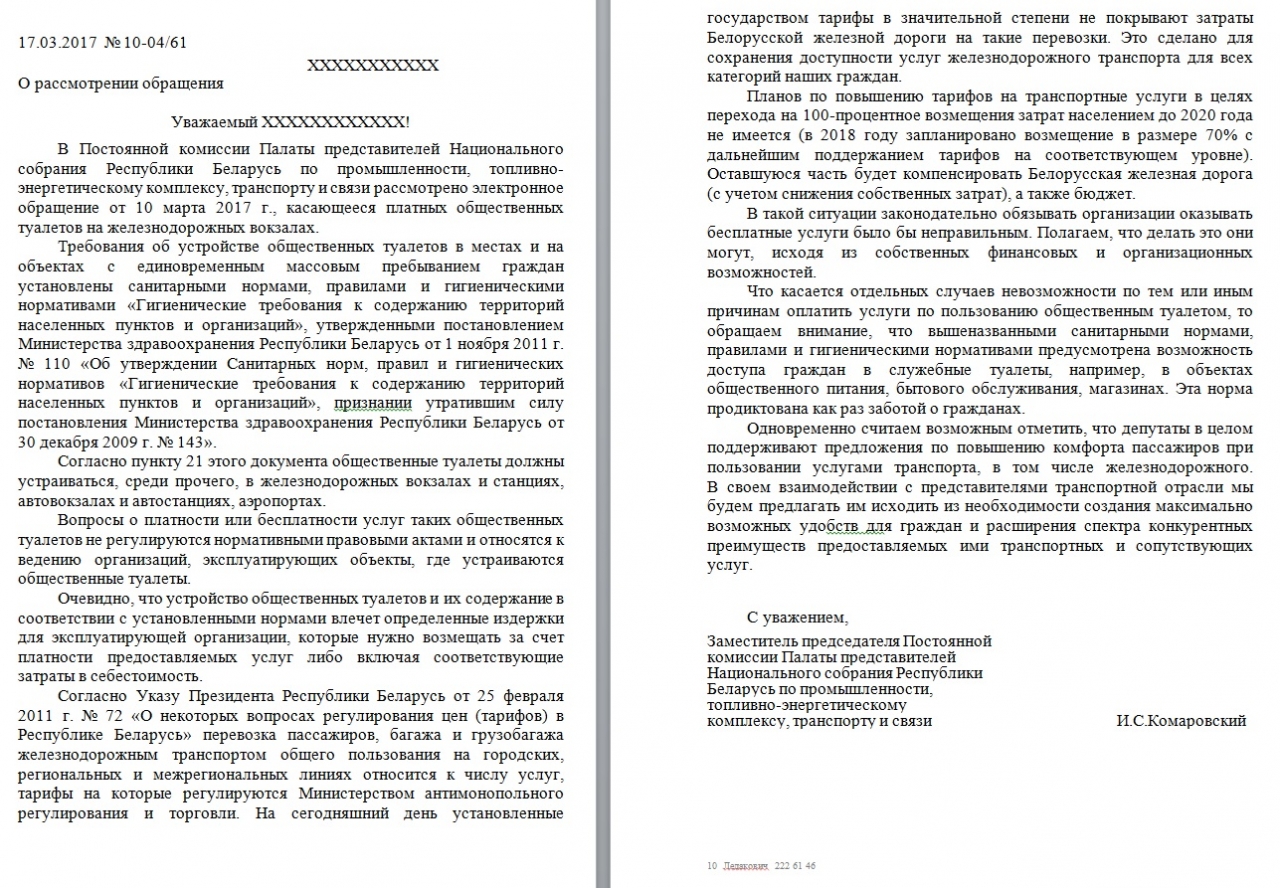 Также необходимо подчеркнуть, что проблема с платными общественными туалетами на вокзалах для пассажиров ущемляет их права и подрывает здоровье. Просим рассмотреть ситуацию с платными туалетами на вокзалах для пассажиров в пределах вашей компетенции и по сути проблемы в целом. Просим вас руководствоваться Законом "О здравоохранении" РБ и другими нормативно-правовыми актами о человеке и его здоровье.