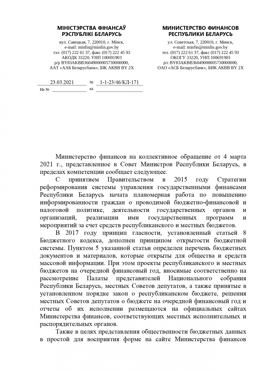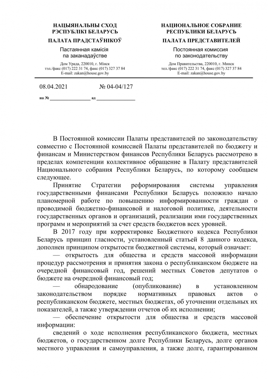 В статье 8 Бюджетного кодекса Республики Беларусь закреплен принцип гласности и открытости бюджетной системы. Этот принцип предполагает обнародование республиканского и местных бюджетов, открытость для общества и СМИ процедур их рассмотрения.