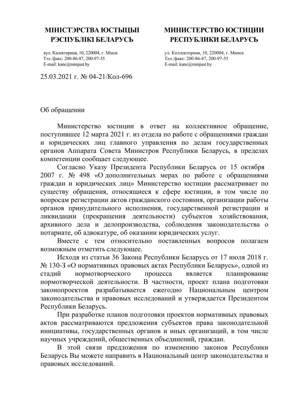 1. В статье 7 Закона Республики Беларусь от 17 июля 2018 г. № 130-З «О нормативных правовых актах» исключить норму, которой установлен запрет общественных обсуждений проектов актов бюджетного законодательства;