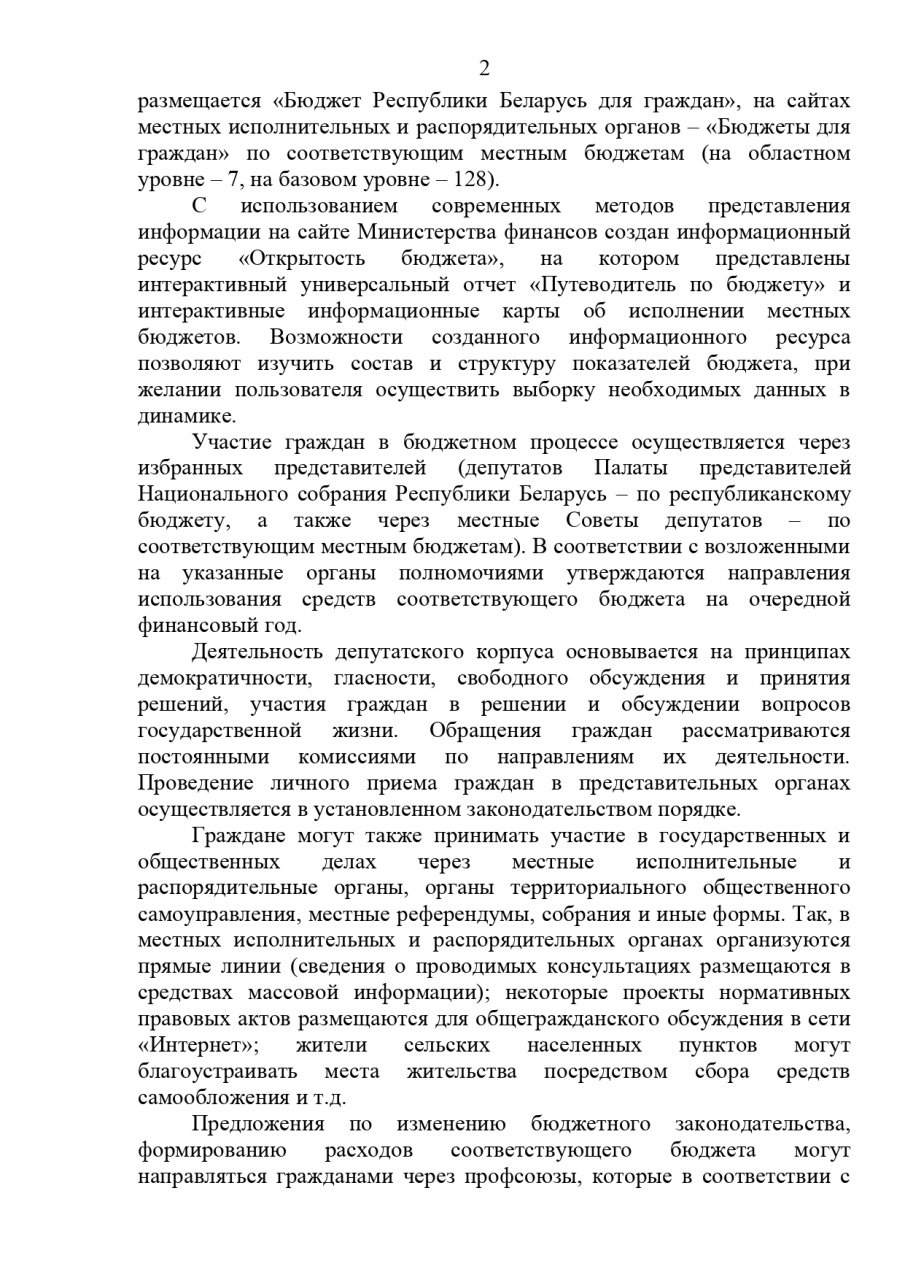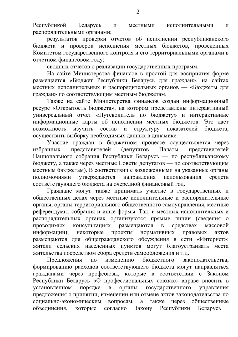 2. Бюджетный кодекс Республики Беларусь от 16 июля 2008 г. № 412-З дополнить нормами об общественном участии в бюджетном процессе в форме публичных слушаний и «бюджета гражданского участия». Кодекс должен закрепить финансово-юридическое понятие «бюджет гражданского участия» и принципы его регулирования в общем бюджетном устройстве государства;