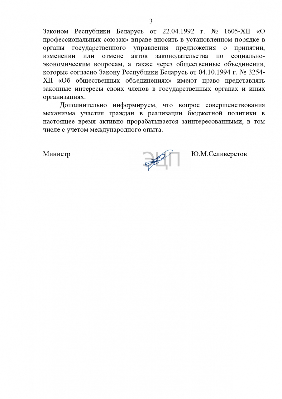 3. Закон Республики Беларусь от 4 января 2010 г. № 108-З «О местном управлении и самоуправлении в Республике Беларусь» дополнить нормами о порядке организации публичных слушаний, в том числе по проектам местных бюджетов и отчетам об исполнении, а также нормами, регулирующими полномочия местных органов власти, институтов и представителей гражданского общества в реализации «Бюджета гражданского участия».