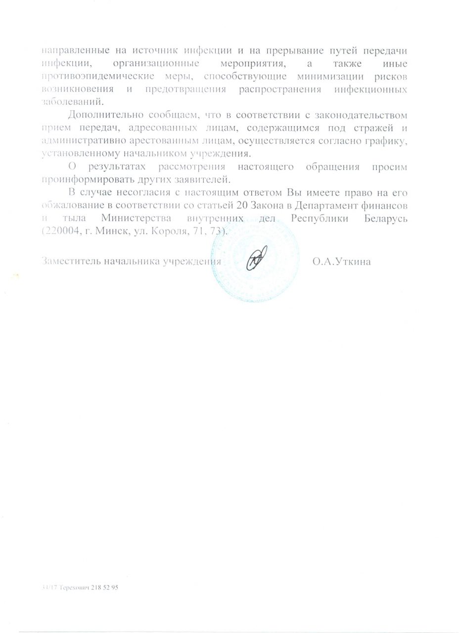 В январе 2021 г. руководства Центра изоляции правонарушителей (ЦИП), Изолятора временного содержания (ИВС) на ул.Окрестина и ИВС в Жодино объявили о запрете на приём передач для административно арестованных. Согласно официальному обоснованию, данное решение принято «в целях обеспечения безопасности и уменьшения рисков, связанных с распространением на территории Беларусь COVID-19». Однако, такое ограничение является незаконным, необоснованным и негуманным.