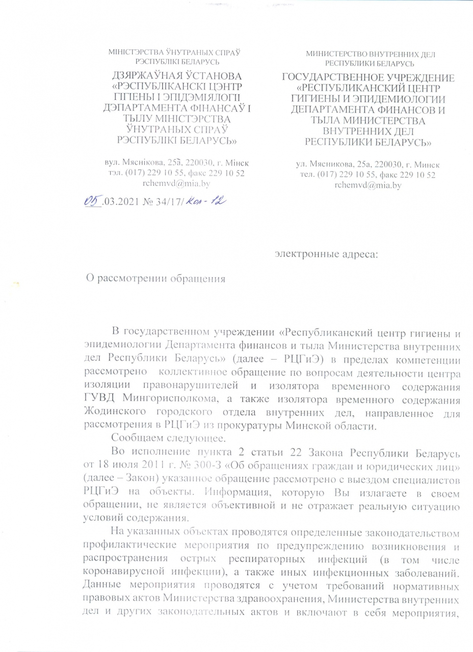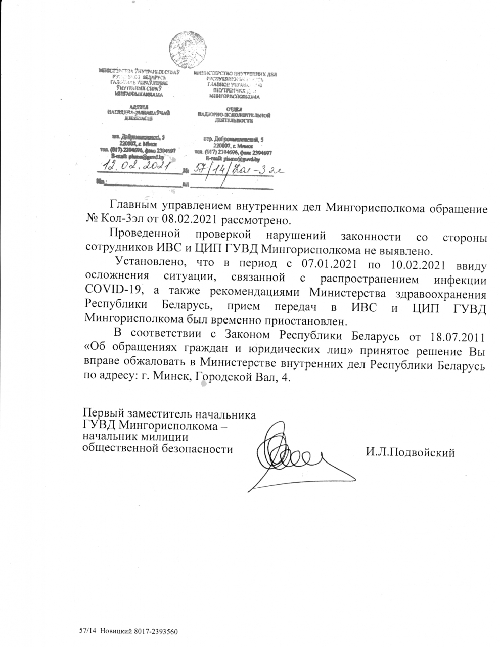 Проведённой проверкой нарушений законности со стороны сотрудников ИВС и ЦИП ГУВД Мингорисполкома не выявлено.