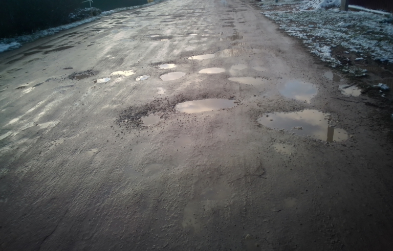 Дорога по улице Ореховской имеет грунтово-щебёночное покрытие. Дефекты в виде ям образующиеся в результате эксплуатации дороги не соответствуют СТБ 1291-2016, а значит препятствуют быстрому и