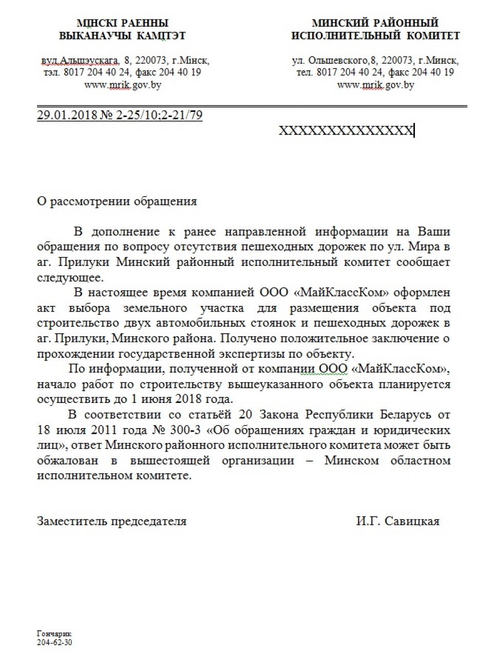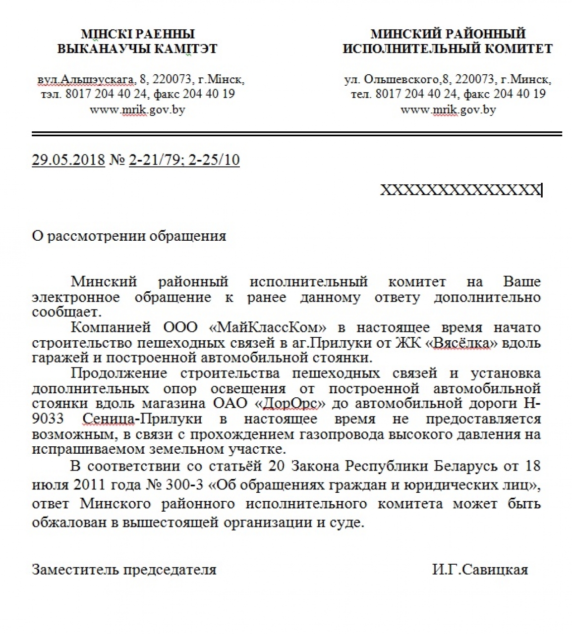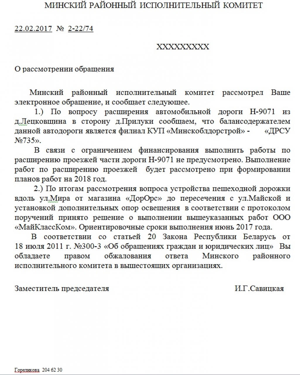 1. На участке дороги от д. Лецковщина в направлении аг. Прилуки, проезжая часть автодороги имеет всего одну полосу для движения автомобилей в обоих направлениях. Такая схема движения автотранспорта является не безопасной для её участников. Для того чтобы разъехаться, автомобилям движущимся в противоположных направлениях, нужно съезжать на обочину. Данный участок дороги становится всё более и более нагруженным, так как в аг. Прилуки развернута масштабная стройка жилого квартала, и жители активно используют эту дорогу. Дорогу Прилуки - Лецковщина часто используют пешеходы, среди которых дети и пожилые люди, что очень опасно, особенно вечером и ночью. Просим принять меры по расширению данного участка дороги и обезопасить передвижение автотранспорта и пешеходов по ней.